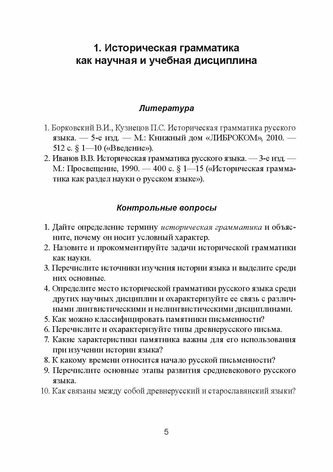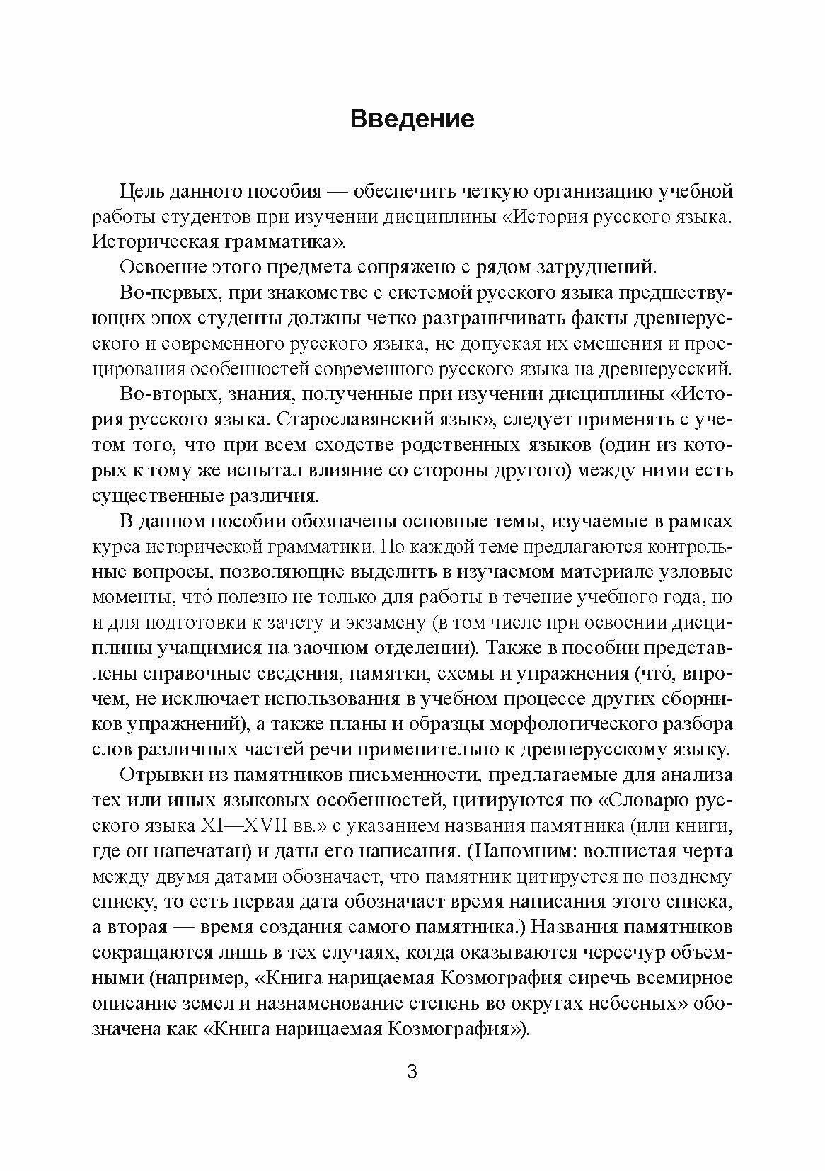 Цель пособия - обеспечить четкую организацию учебной работы студентов при изучении дисциплины "История русского языка. Историческая грамматика". По каждой теме предлагаются контрольные вопросы, позволяющие выделить в изучаемом материале основные моменты, что полезно не только для работы в течение учебного года, но и для подготовки к зачету и экзамену. Также в пособии представлены справочные сведения, памятки, схемы и упражнения (что, впрочем, не исключает использования в учебном процессе других сборников упражнений), а также планы и образцы морфологического разбора слов различных частей речи применительно к древнерусскому языку. К пособию прилагаются рекомендации по переводу древнерусских текстов и терминологический словарь, а также примерные планы характеристики исторических изменений в фонетике и морфологии.