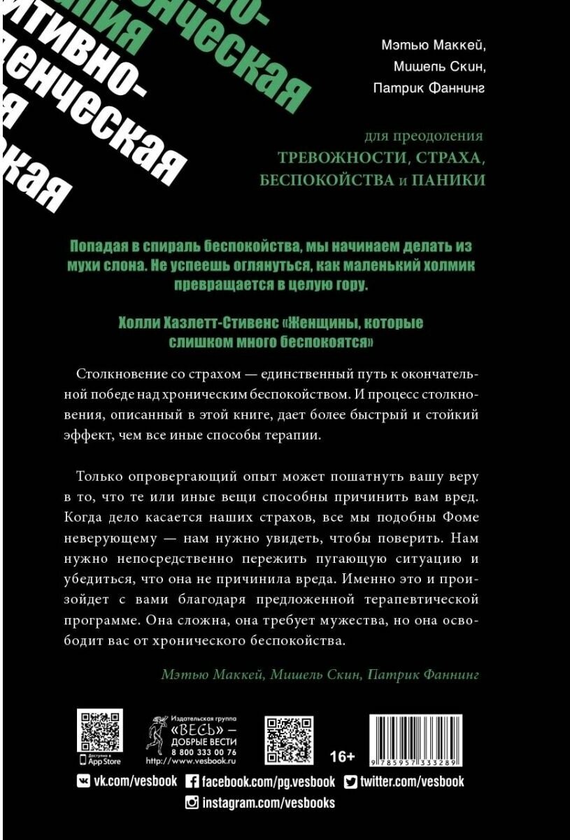 Исследования убедительно доказывают, что именно когнитивно-поведенческая терапия является наиболее эффективным методом лечения тревожных состояний. Она дает лучший результат, чем медикаменты, психоанализ или гипноз. Кроме того, вы можете использовать приемы когнитивно-поведенческой терапии самостоятельно, все необходимые инструменты даны в этой книге.