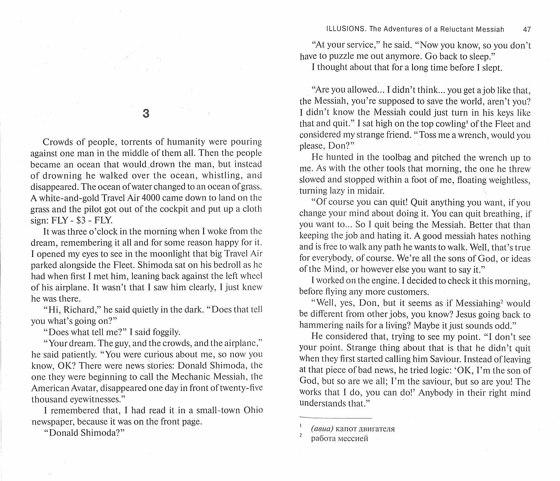 Книга "Иллюзии. Приключения Мессии поневоле" была опубликована семь лет спустя. Главный герой - сам Ричард Бах- зарабатывает на хлеб, развлекая желающих прогулками на своём самолёте. Однажды он встречает другого лётчика, занятого тем же делом. Вскоре оказывается, что новый друг Ричарда - не обычный человек…