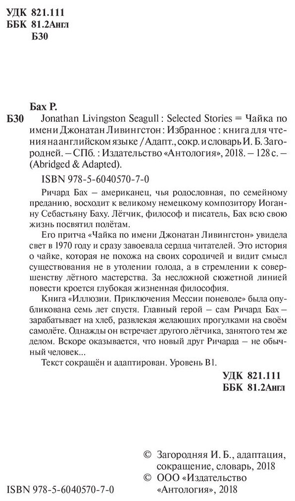 Сервис сравнения цен СкидкаГИД предлагает сравнить цены на товар «Книга: Чайка по имени Джонатан Ливингстон (Jonathan Livingston Seagull). Книга для чтения на английском язы (Бах Ричард); Антология, 2018»