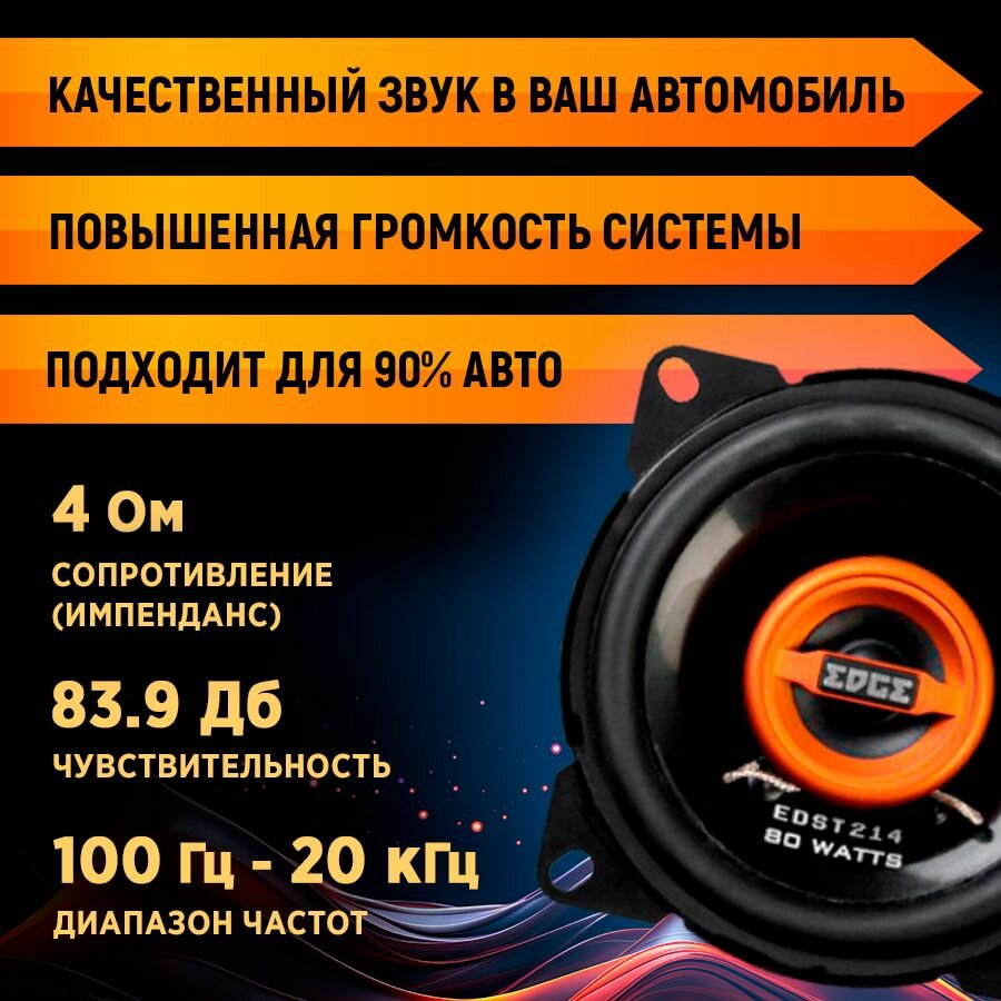 Автомобильные колонки Edge EDST214-E6, максимальная мощность 80 Вт, размер динамика 10 см (4 дюйм.), коаксиальные, двухполосные, чувствительность 84дБ, импеданс 4Ом