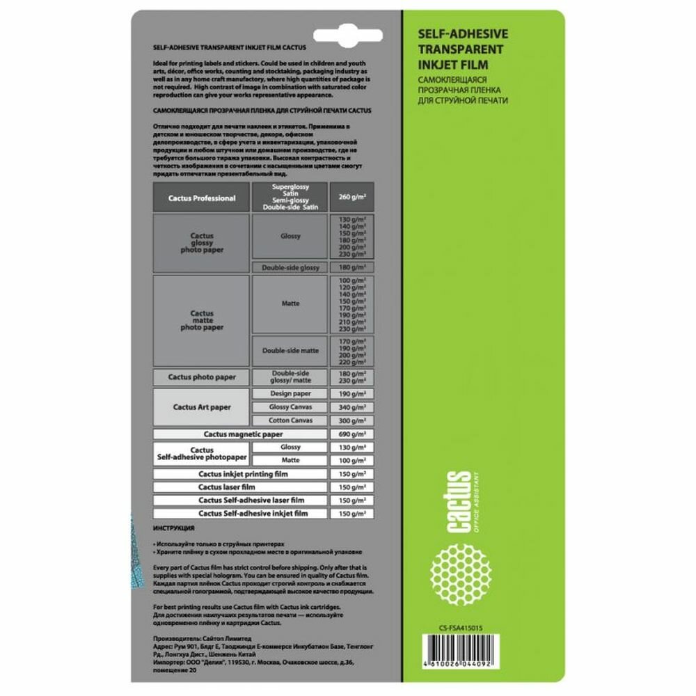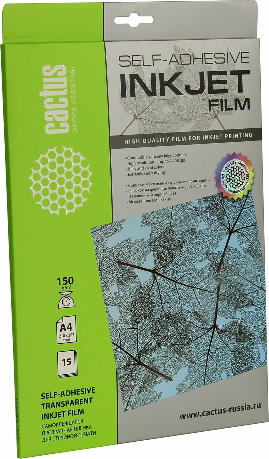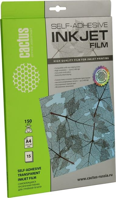 Пленка Cactus A4/150г/м2/15л./прозрачный самоклей. для струйной печати