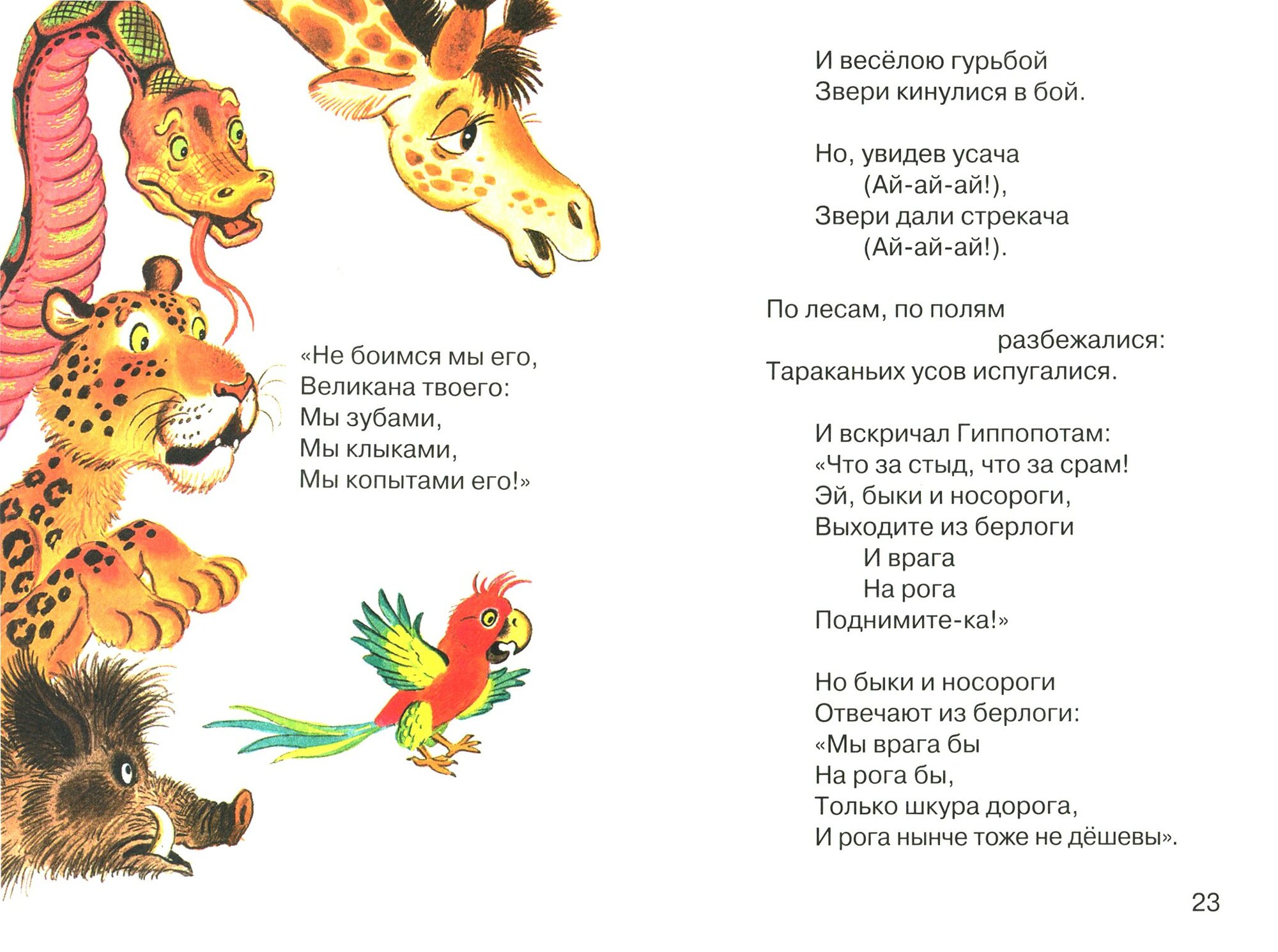 страницы - качественная, достаточно плотная, офсетная бумага. Иллюстрации рисованные, не компьютерные, НО разных художников и их МАЛО. Текста на страницах много, а на рисунках отражены только одна-две строчки. При этом не каждый рисунок процитирован в книге. Например к "Таракану" нарисованы кабан, попугай, змея, жираф, леопард, панда, гиена, морж! (он-то что в этом климате забыл?!), и нет ни раков-забияк, ни китов, носорогов, обезьян, акулы, каракатицы... Иной раз складывается ощущение, что вообще иллюстрации не к этому произведению.
