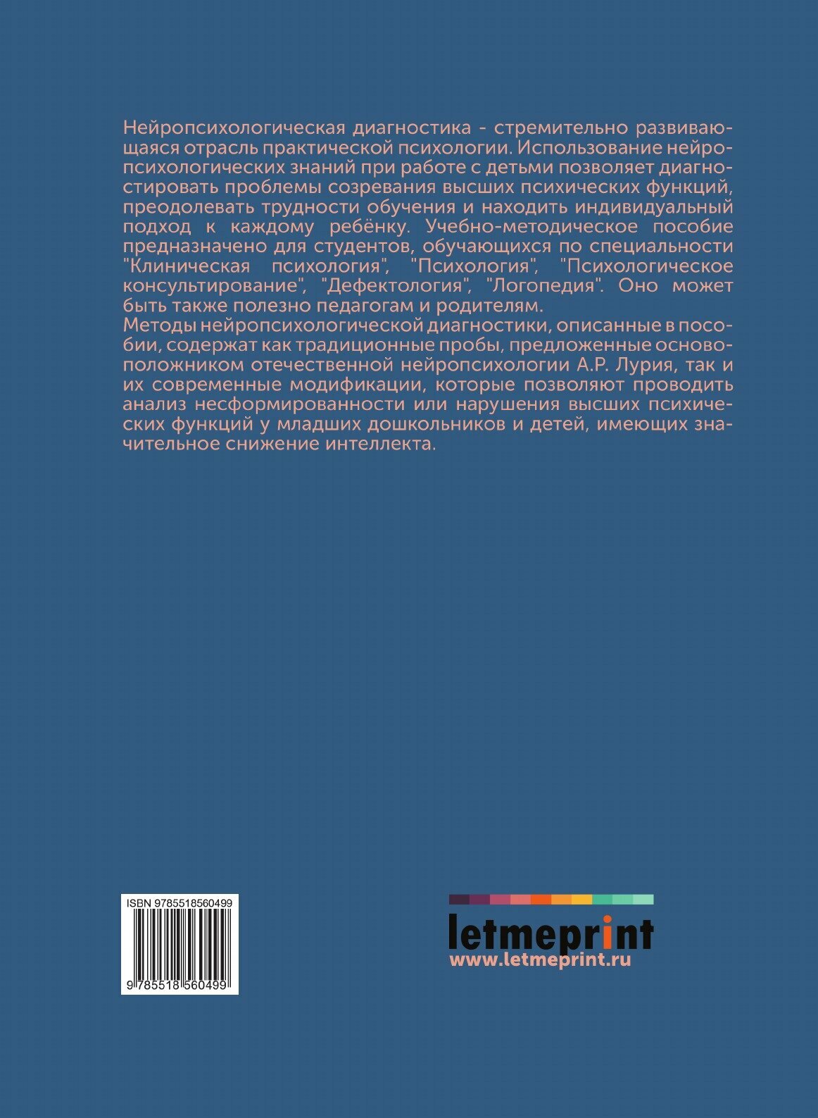 Нейропсихологическая диагностика - стремительно развивающаяся отрасль практической психологии. Использование нейропсихологических знаний при работе с детьми позволяет диагностировать проблемы созревания высших психических функций, преодолевать трудности обучения и находить индивидуальный подход к каждому ребёнку. Учебно-методическое пособие предназначено для студентов, обучающихся по специальности "Клиническая психология", "Психология", "Психологическое консультирование", "Дефектология", "Логопедия". Оно может быть также полезно педагогам и родителям.