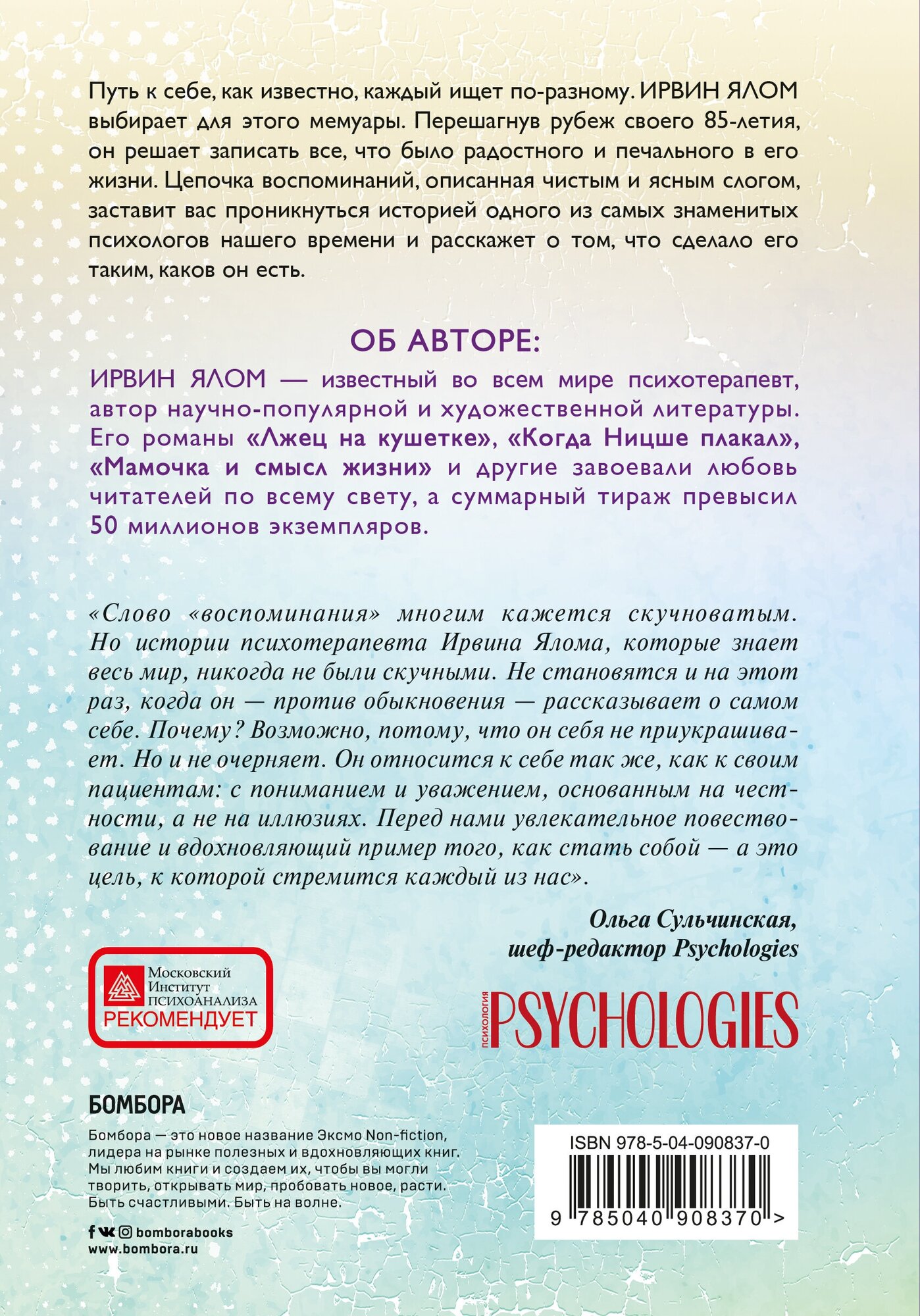 Ирвин Ялом написал удивительно откровенную книгу о своей жизни, работе, творчестве, семье и друзьях. Мне было особенно интересно узнать историю создания его книг, большую часть из которых я прочитала.