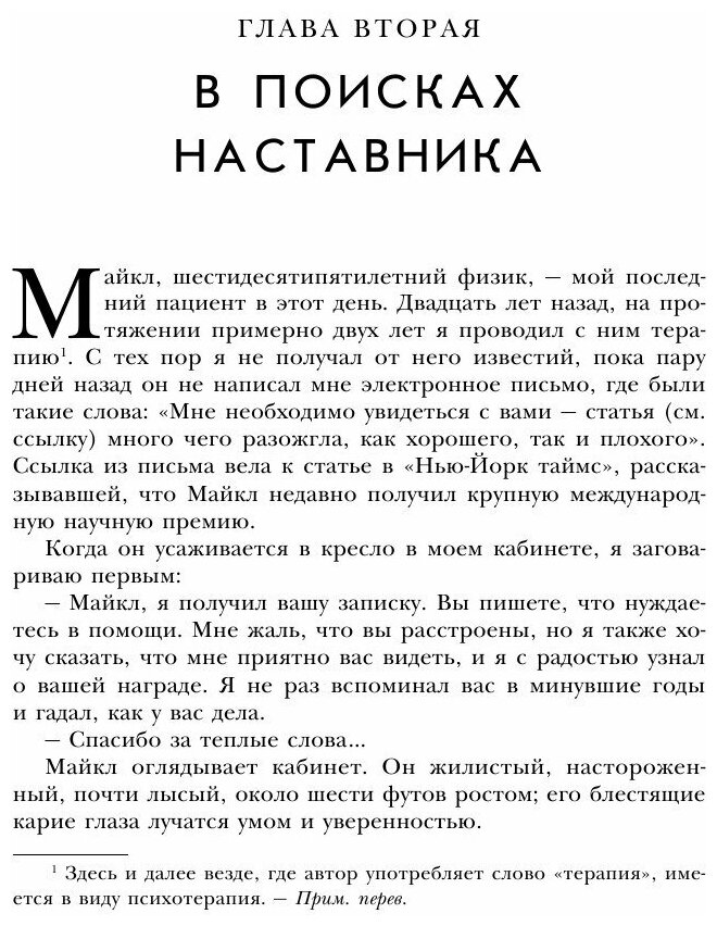 Ирвин Ялом в очередной раз радует своим произведением. Книга написана по уже типичному для автора способу повествования, но к историям из жизни пациентов Ялом добавляет истории из своей жизни, свои сны и грезы. Ялом раскрывает нам историю своей жизни, историю того, как он стал одним из самых успешных специалистов в своём роде. Книга хорошо оформлена, бумага тонкая, светлая, читается легко.