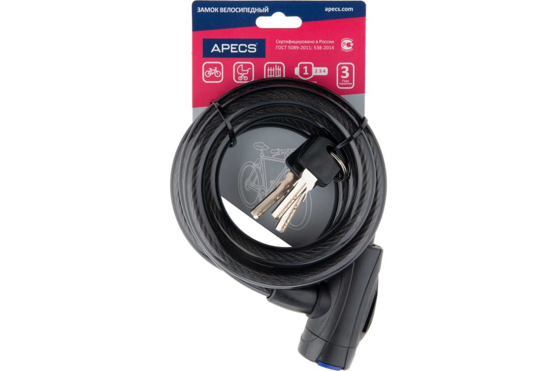 Замок предназначен для привязывания велосипедов, колясок, мотоциклов и др. движимого имущества. Замок автоматический, т.е. закрывается без использования ключа. В комплект входят 3 стальных ключа с пластиковой головкой.