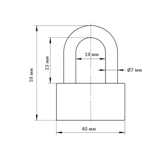 проем дужки - 23 мм по высоте и 19 мм по ширине. Габариты замка - 40х59 мм. Комплектуется 3 ключами.