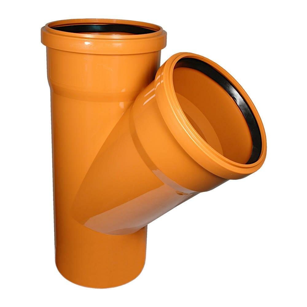 Тройник используется для фиксации под углом 45 градусов центральной и вспомогательной магистралей канализационного трубопровода.