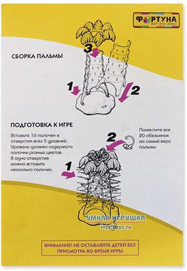 Правила игры - не уронить ни одной обезьянки, или уронить но как можно меньше! Палочки в пальме образуют сетку для ловли обезьянок. Вытягивая палочку, ухитритесь перевесить обезьянку на другую палочку. Игра развивает ловкость, аккуратность и умение действовать без спешки. Легко научиться, весело играть! В игре могут принять участие 2 и более игрока.