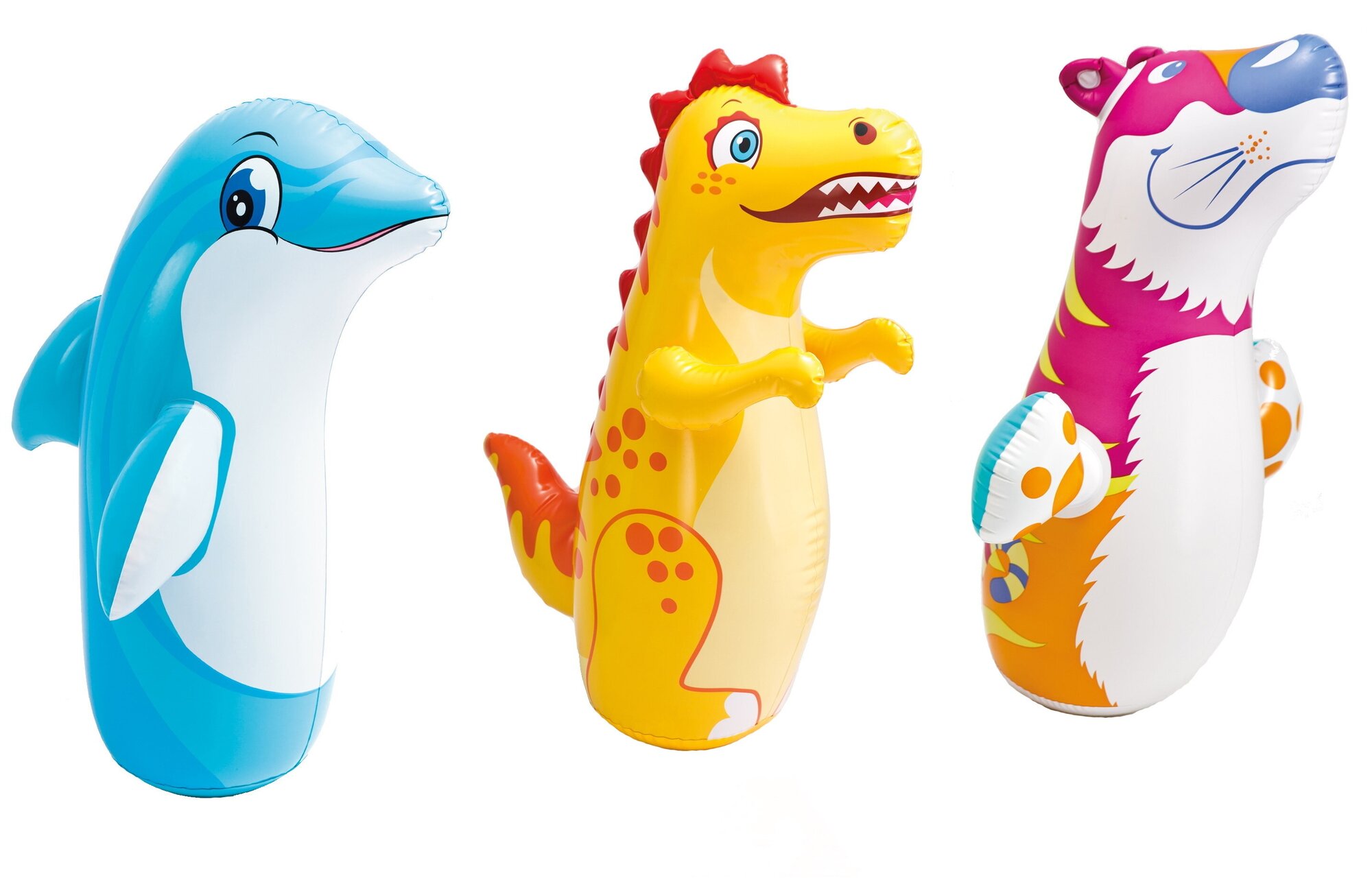Надувные игрушки-неваляшки 44669 поставляются трех видов: Дельфин, Динозавр и Тигр. Надувная игрушка имеет нижний отсек-утяжелитель для наполнения водой. После его наполнения игрушка приобретает свойства неваляшки и ребенок может с ней играть, в том числе и использовать ее для боксирования. Игрушка предназначена для детей в возрасте от 3 лет. Насос приобретается отдельно.