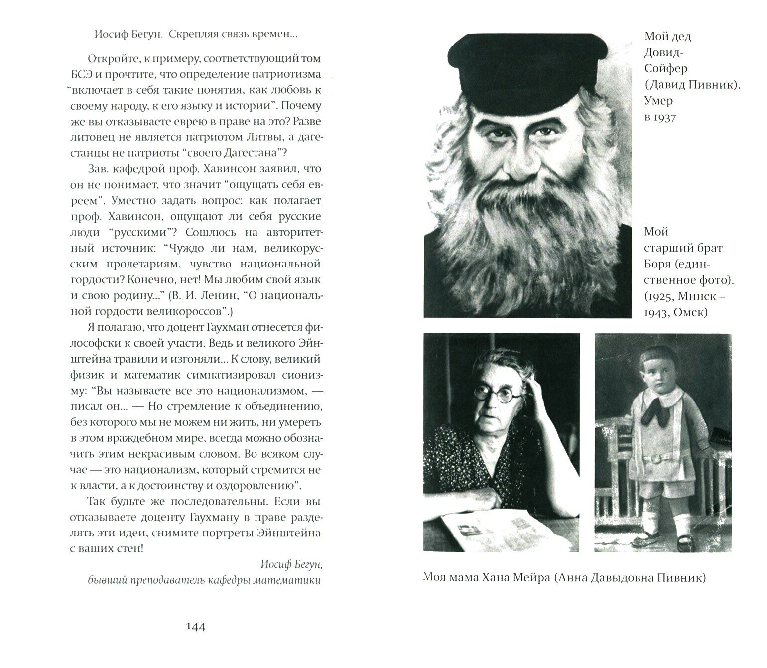 Иосиф Бегун, борец за права евреев в Советском Союзе, более семи лет провел в тюрьмах, лагерях и ссылке. Его судьба и правозащитная деятельность получили мировую известность, о нем был снят фильм "Yosef Begun - Human Rights Limited". Иосиф Бегун отстаивал право легально преподавать иврит, участвовал в самиздате, содействовал распространению еврейской культуры в годы жестоких ограничений и преследований.