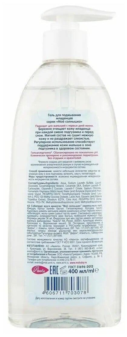 Специальный состав с натуральной молочной кислотой нейтрализует вредное воздействие щелочной среды после контакта с намокнувшим подгузникомМягкий, гипоаллергенный состав без отдушек и красителей не сушит кожу и не раздражает слизистые. Сбалансированная pH- формула не нарушает естественный кислотно-щелочной баланс кожи, сохраняя ее защитные функции. Бережно очищает кожу и может применяться так часто, как это необходимо. Продукт рекомендован для применения у детей с первых дней жизни.Клинически проверено и рекомендовано ФГУ «МНИИ Педиатрии и детской хирургии Минздрава России».