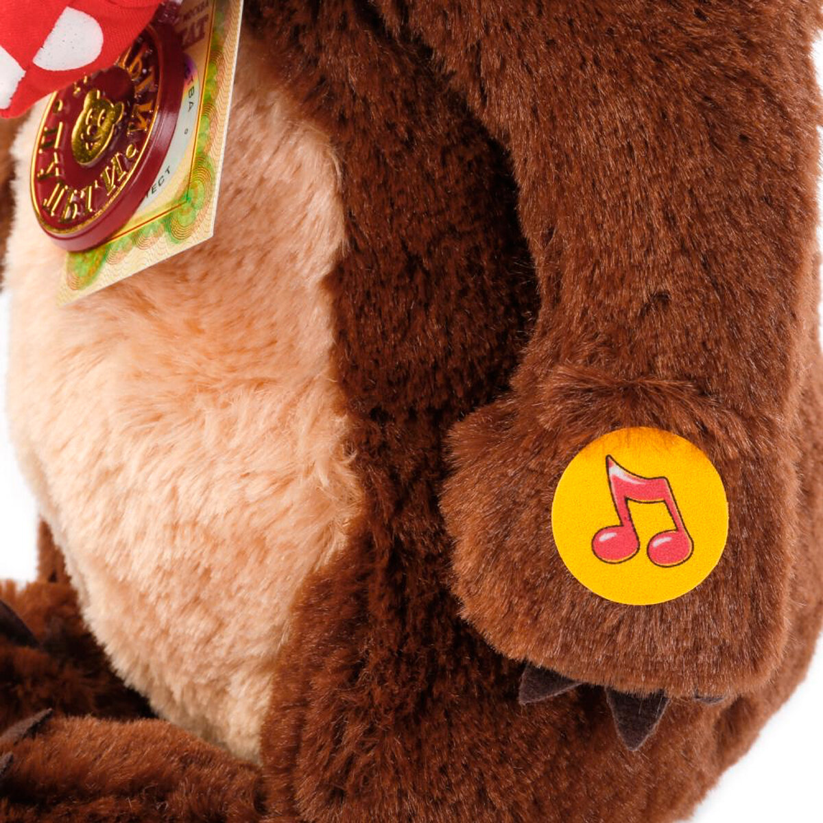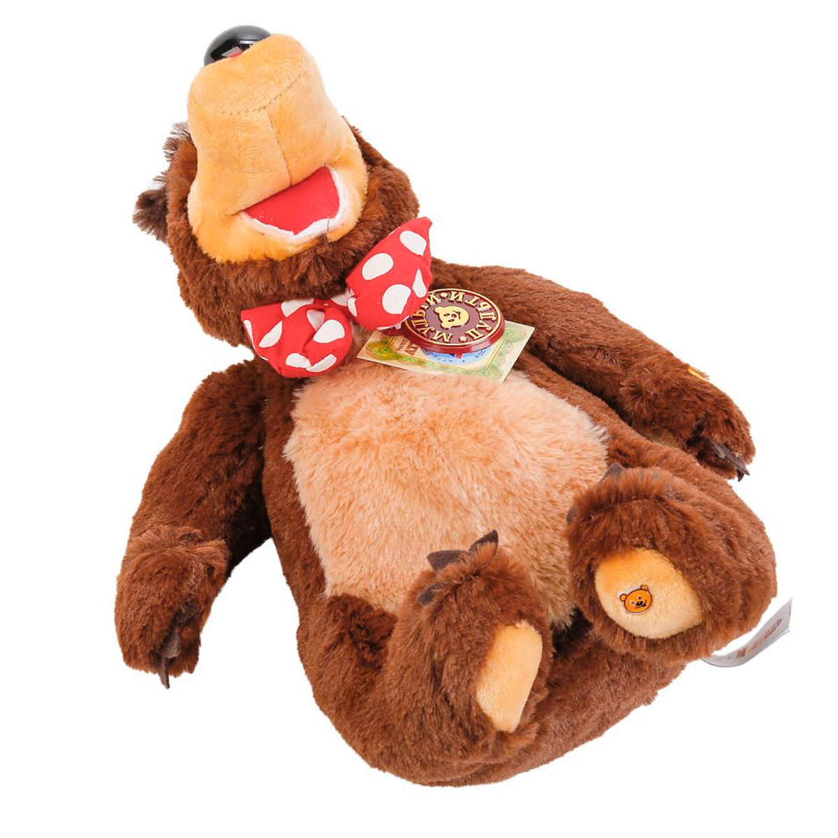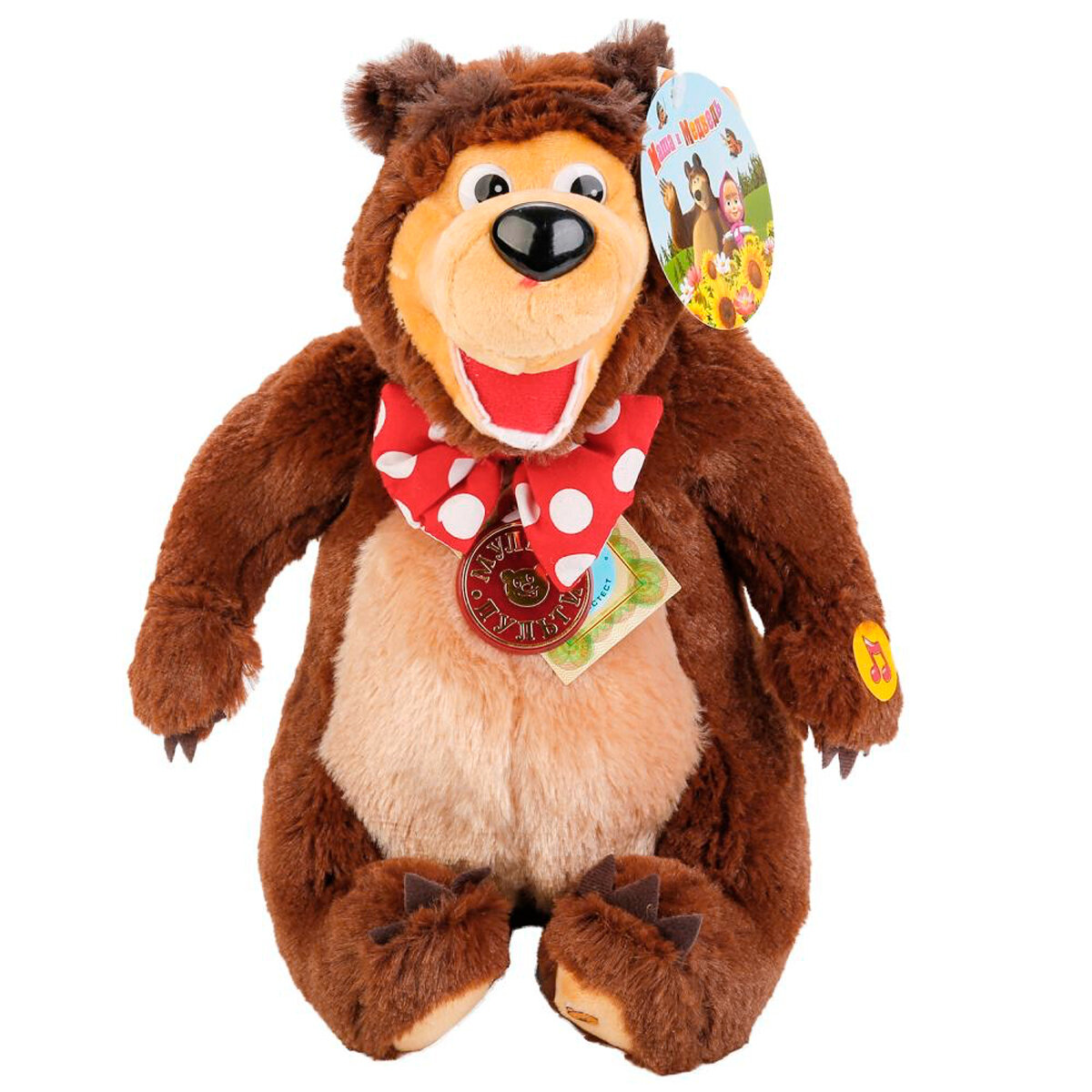 Очеровательный мягкий Мишка, герой из мультфильма "Маша и Медведь" высотой 28 см, станет прекрасным подарком для ребенка. Медвежонок коричневого цвета, с яркой бабочкой на шеи. Игрушка изготовлена из безопасного, приятного на ощупь искусственного материала. Нажав на на животик Мишки от скажет фразы из мультфильма и споет песенку, что развлечет малыша. Развивает фантазию, тактильное и слуховое восприятие.