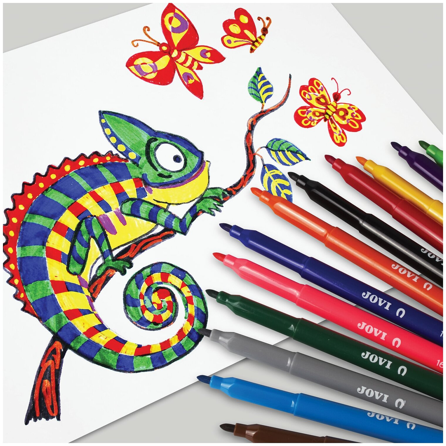 Подросшему художнику, освоившему цветные карандаши и восковые мелки, можно раздвинуть творческие горизонты и перейти к рисованию яркими и необычными фломастерами. Пригодятся они и школьникам для разукрашивания, создания рисунков, для прорисовки деталей для чертежей, плакатов и для других оформительских работ. Набор цветных фломастеров – это отличный подарок для маленьких художников. Фломастеры оставляют на бумаге яркие и четкие линии, что очень нравится детям, замечательно подходят для детского творчества – рисования и раскрашивания на бумаге и картоне. Чернила фломастеров изготовлены на основе пищевых красителей, а значит, безопасны для ребенка. Особо прочный пишущий конец стержня, проветривающийся и защищенный от деформации колпачок, тоже являются положительным фактором. Фибровый наконечник позволяет варьировать ширину линии. Что немаловажно, фломастеры легко смываются с рук и отстирываются от одежды