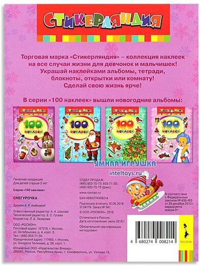 На сегодняшний день товар «Наклейки Росмэн Стикерляндия Снегурочка 100 наклеек (24179)» можно купить с кешбеком в 1 магазине: Яндекс.Маркет