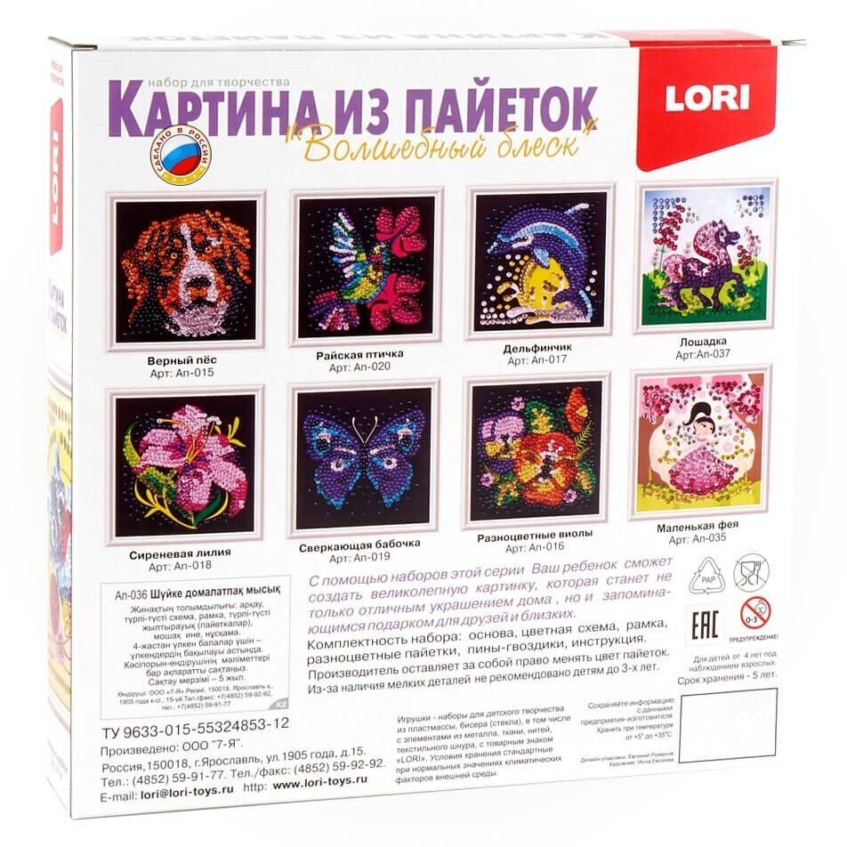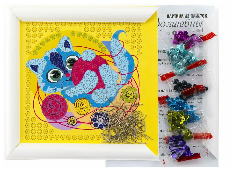 | Состав набора | основа, цветная схема, рамка, разноцветные пайетки, пины-гвоздики, инструкция |