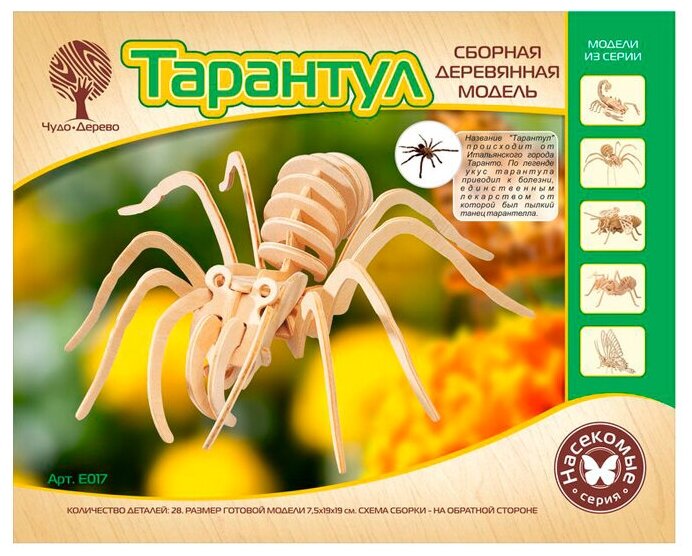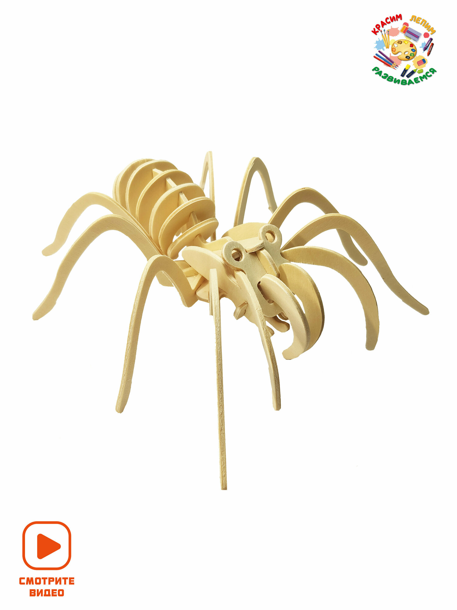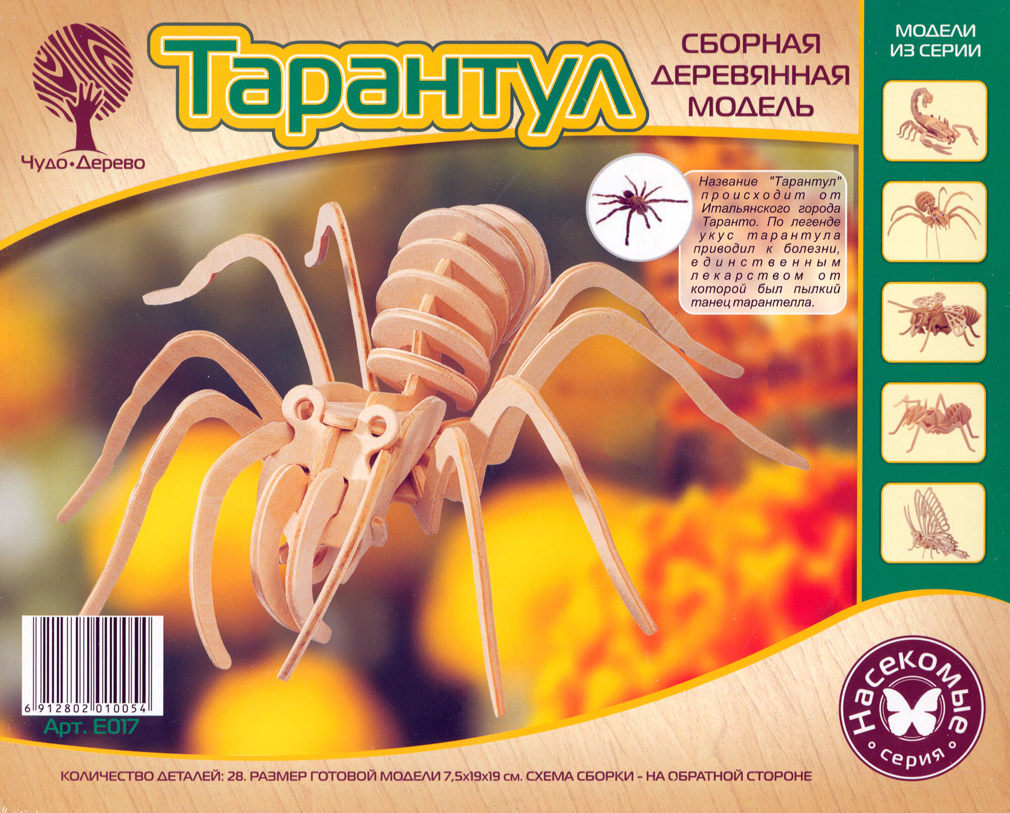 Соберите деревянную модель, и у вас дома поселится обаятельный тарантул. В комплекте набора есть подробная инструкция, поэтому со сборкой без труда справится даже ребенок от пяти лет. Потом объемную модель можно раскрасить и покрыть лаком, придав тарантулу совершенно необыкновенный вид. Все детали выполнены из качественной фанеры, которая не содержит формальдегид и абсолютно безопасна для здоровья. Возраст: от 7 лет Для мальчиков и девочек Количество деталей: 2 пластины с деталями, инструкция по сборке.