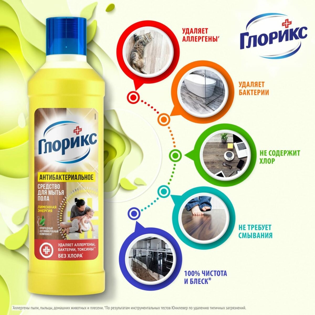 Средство Glorix для мытья пола можно использовать для всех небольших поверхностей дома и всех видов покрытий: линолеума, кафеля, ламината, искусственного камня, пластика, паркета и других, а также есть вариант продукта для деликатных поверхностей. Эффективно очищая и дезинфицируя поверхности без хлора, Glorix не только уничтожает болезнетворные бактерии, но и наполняет дом приятным ароматом. Может использоваться ежедневно для гигиены в доме.