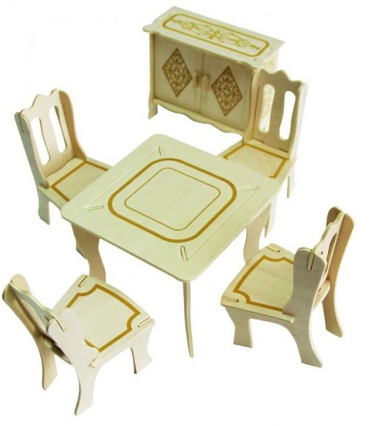 Сборная деревянная модель Мебель для кукол Гостиная несет в себе не только практическую функцию, но и увеселительную. Ведь это очень забавно и интересно своими руками создавать предметы мебели, которыми впоследствии будут пользоваться любимые куколки. Эта мебель собирается быстро, при этом все детали прочно соединяются между собой. Собрав полностью эту гостиную, малышка увидит перед собой стол, четыре стула и комод. Мебель выглядит изящно и благородно.
