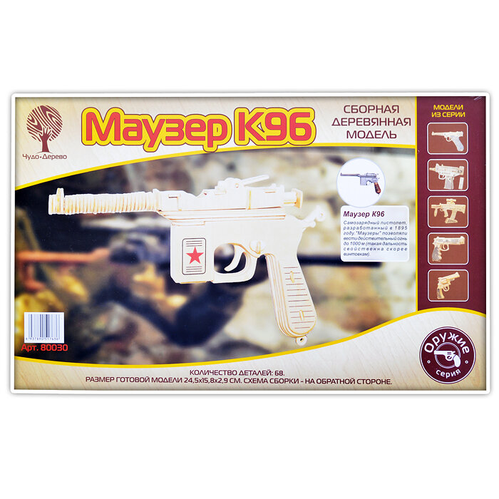 Замечательная сборная модель из дерева позволит воссоздать легендарный пистолет Маузер К96. С подобным оружием можно было вести бой на расстоянии до тысячи метров, что удавалось в те времена, когда была война, лишь винтовкам. Естественно, деревянная модель лишена функционала оригинального пистолета, однако не уступает прототипу во внешних характеристиках. После осуществления сборки можно покрасить модель красками (продаются отдельно) в соответствии с расцветкой настоящего пистолета.