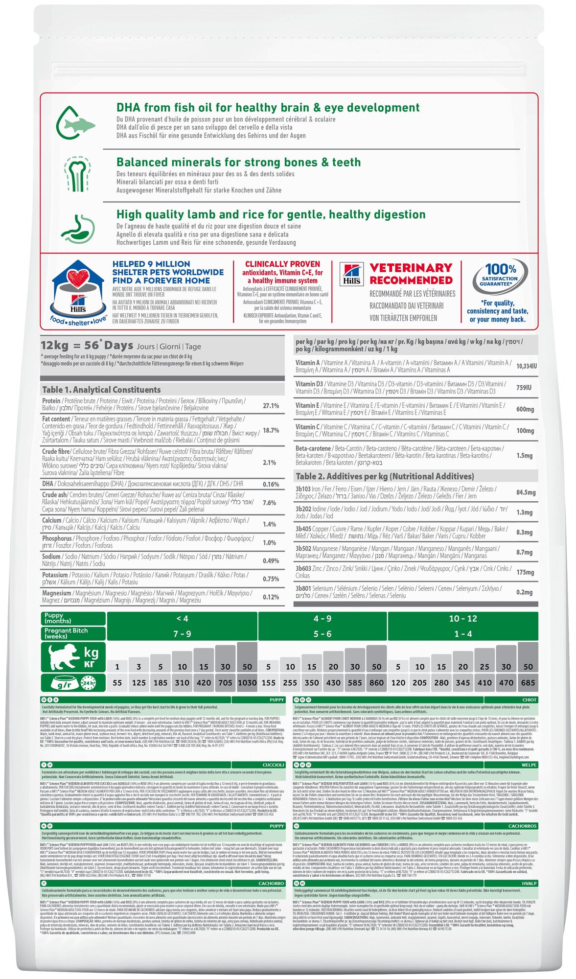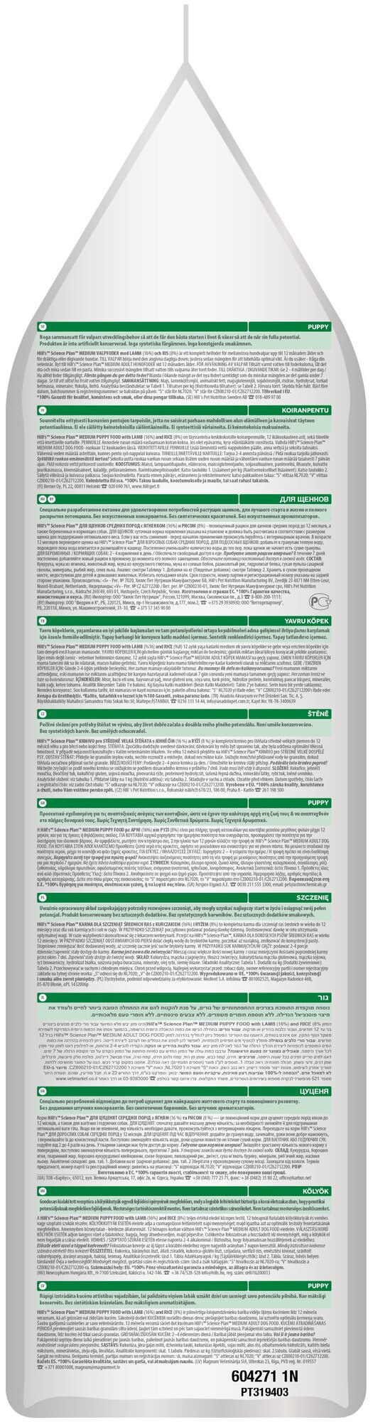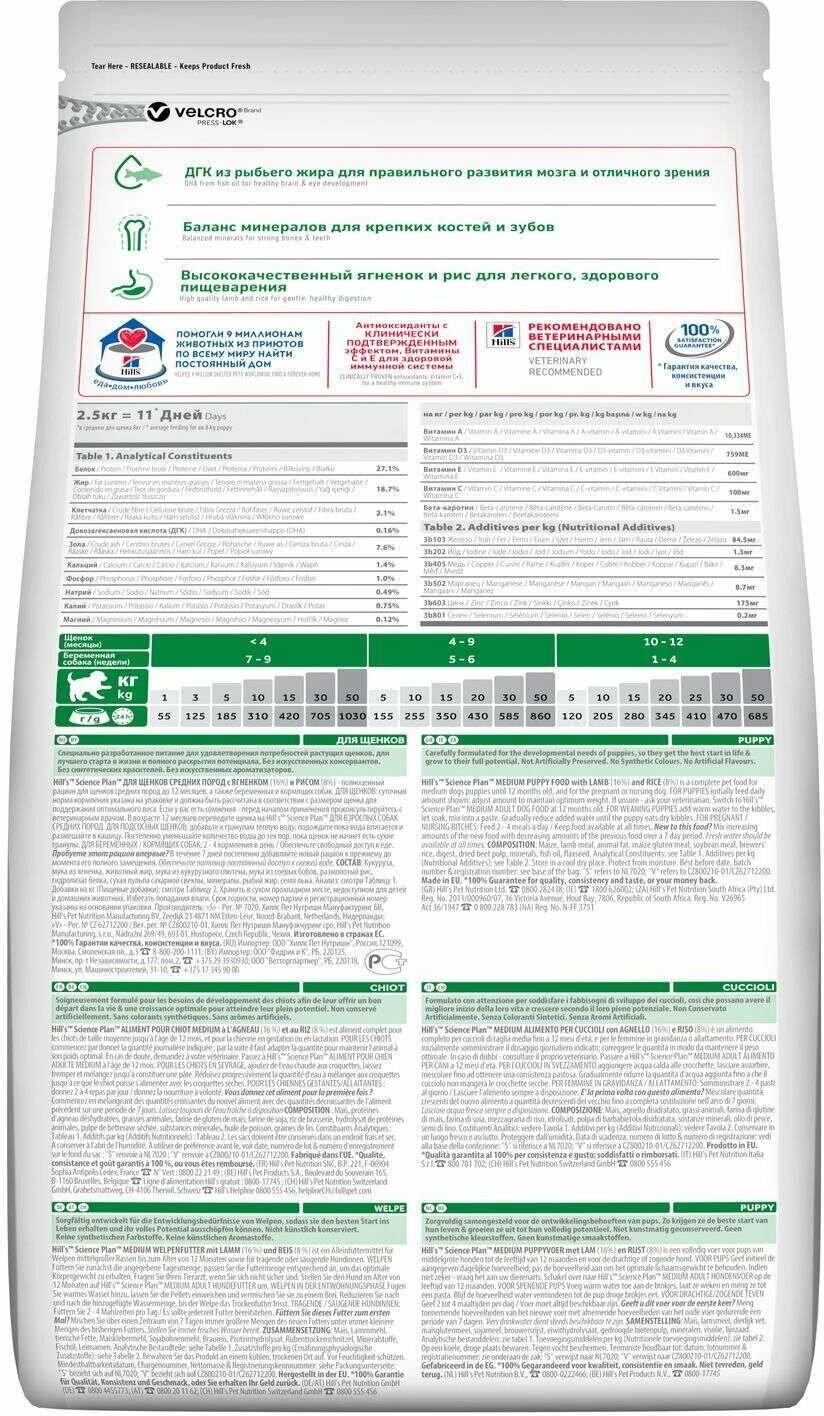 Hill's™ Science Plan™ Puppy Healthy Development™ Medium сформулирован для поддержания иммунной системы и подвижности у щенков средних пород: - С антиоксидантами с клинически подтвержденным эффектом и ДГК из рыбьего жира. - Антиоксиданты с клинически подтвержденным эффектом для здоровья иммунной системы - Омега-3 жирные кислоты и оптимальный уровень минералов для правильного развития скелета и подвижности - Ингредиенты высокого качества для легкого пищеварения. Великолепный вкус. Переводите на рацион Science Plan™ Advanced Fitness по достижении возраста 12 месяцев. Пробуете этот рацион впервые? Постепенно в течение 7 дней переводите животное на новый рацион, увеличивая его содержание по отношению к прежнему. Обеспечьте питомцу свободный доступ к свежей воде. ДЛЯ ПОДСОСНЫХ ЩЕНКОВ: добавьте к гранулам теплую воду, подождите пока вода впитается и размешайте в кашицу. Постепенно уменьшайте количество воды до тех пор, пока щенок не начнет есть сухие гранулы.