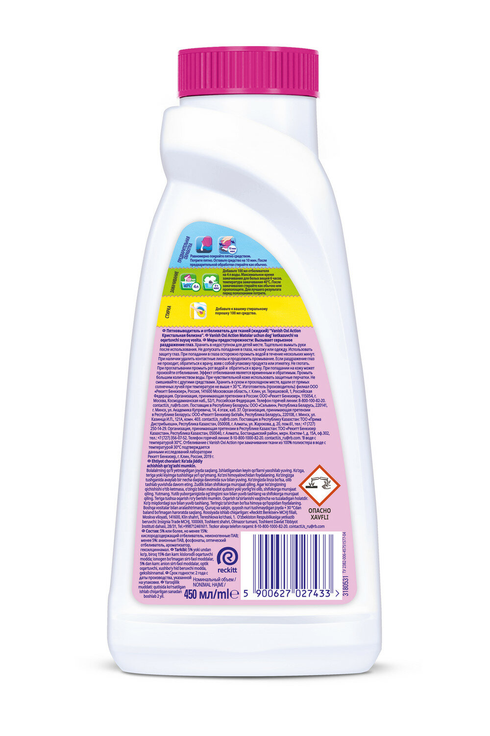 Жидкий пятновыводитель Vanish Oxi Action содержит активный кислород, который удаляет пятна и сохраняет цвет ваших вещей. Подходит для деликатных тканей, шерсти и шелка. Vanish Oxi Action подходит как для белых, так и для цветных вещей.