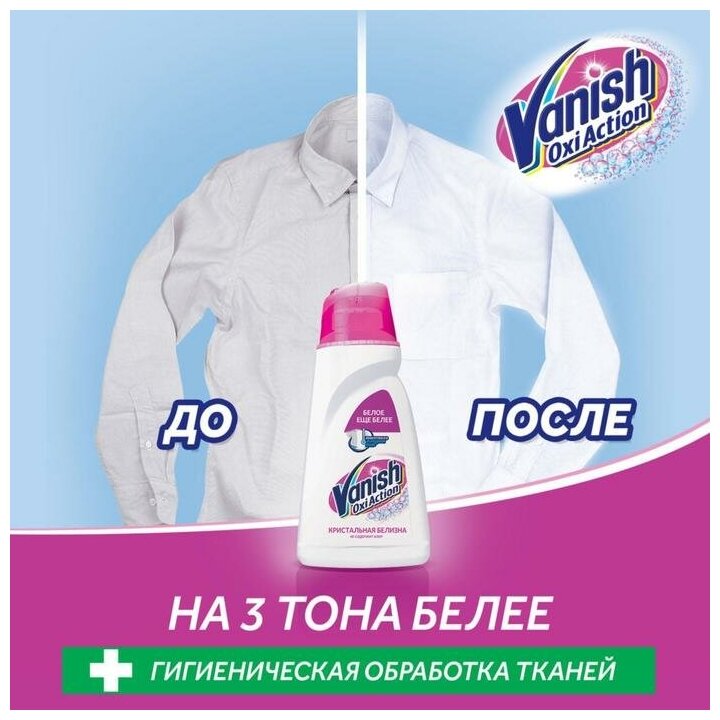 Жидкий Vanish Кристальная Белизна безопасен для белых вещей, так как не содержит хлор. Эффективен при любой температуре, даже при низкой. Подходит для деликатных тканей - шерсти и шелка.
