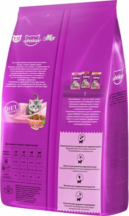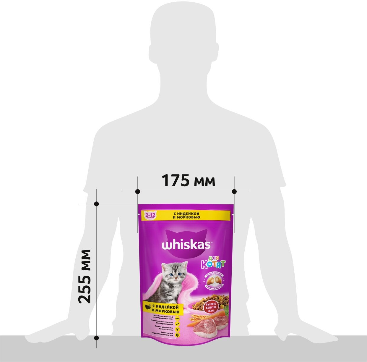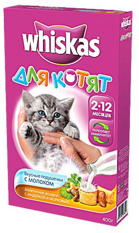 Whiskas ассорти индейка и морковь подушечки с молоком специально разработанная формула сухого питания для котят содержит сбалансированное количество микроэлементов, витаминов и минералов, так необходимых для растущего организма животного.