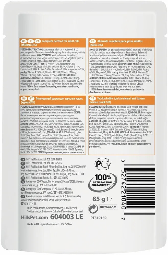 Hill's™ Science Plan™ Feline Adult точно сбалансированное полноценное питание для поддержания оптимального веса, содержит антиоксиданты с клинически подтвержденным эффектом, протеины и обогащен Омега-3 жирными кислотами.