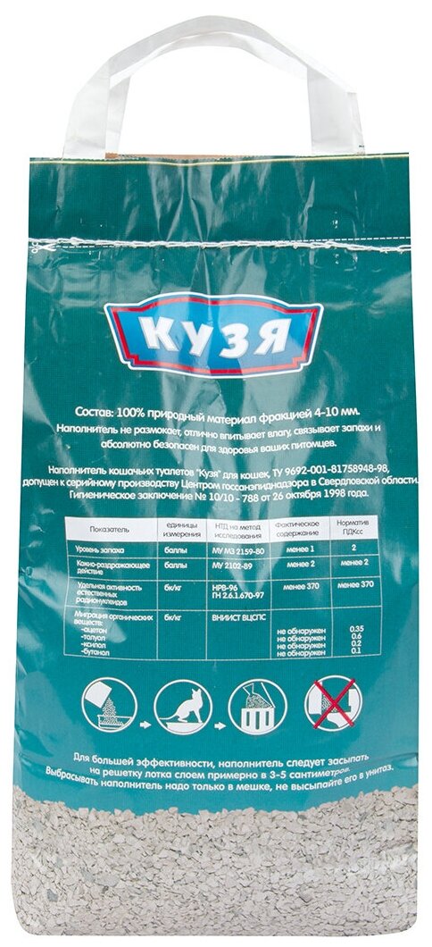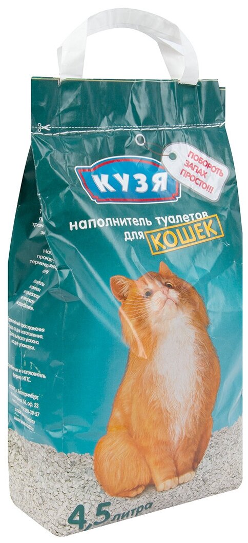 Впитывающий наполнитель Кузя изготовлен из экологически чистой глины по специальной технологии, которая обеспечивает отсутствие пыли и мелкой взвеси. Влагонепроницаемая упаковка объемом 4,5 литра имеет удобную ручку для переноски. Мелкие комочки оптимальны для котят и некрупных пород с короткой шерстью. Запах и жидкость впитываются быстро и без остатка, поэтому в кошачьем туалете поддерживаются сухость и чистота. Особенности Лапы кошки не проваливаются при хождении по туалету, поэтому не возникает испуга и животное быстро привыкает к наполнителю. Продукт не привлекателен для котят в пищевом плане, поскольку гранулы достаточно мелкие и не вызывают желания их погрызть. Глина сама по себе не имеет выраженного запаха, поэтому не раздражает ни людей, ни животных. Наполнитель по структуре напоминает очень крупный песок, что побуждает котенка проявлять природные инстинкты к закапыванию продуктов жизнедеятельности, в результате чего он с удовольствием пользуется лотком.