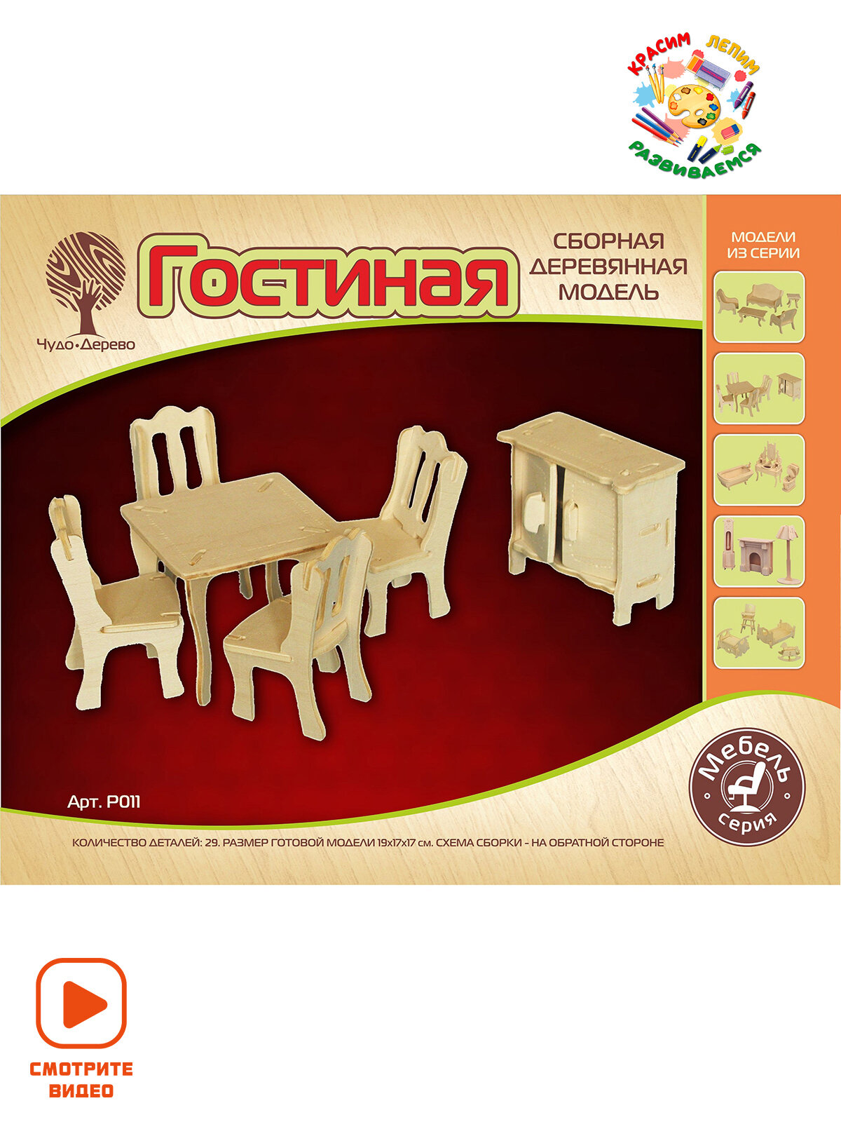 Комплект включает в себя набор деталей, вырезанных на листовом дереве (фанера), схему сборки, наждачную бумагу. Детали скрепляются в порядке и очередности, обозначенной в инструкции. Для прочности соединений рекомендуется использовать клей ПВА (не токсичен, не имеет запаха, после высыхания становится прозрачным, имеет эластичный клеевой шов, при загустевании может быть разбавлен водой).
