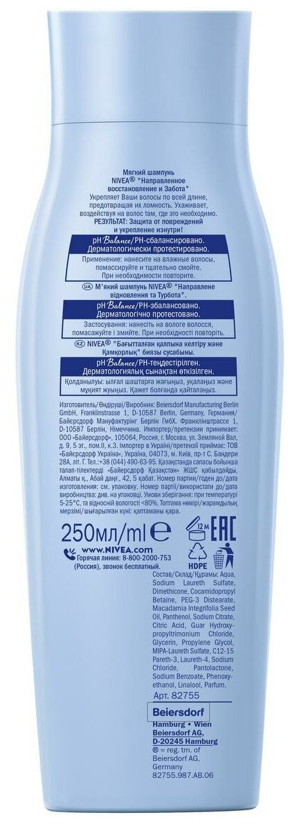 Интенсивный уход и укрепление изнутри. С обновленной линейкой средств по уходу за волосами от Nivea Ваши волосы выглядят красивыми и здоровыми, и к ним приятно прикасаться. Активные компоненты и инновации: Масло Макадамии: проникает в структуру волоса, укрепляя его изнутри. Eucerit (натуральный, ухаживающий компонент, разработанный экспертами Nivea): защищает поверхность волоса от внешних воздействий.