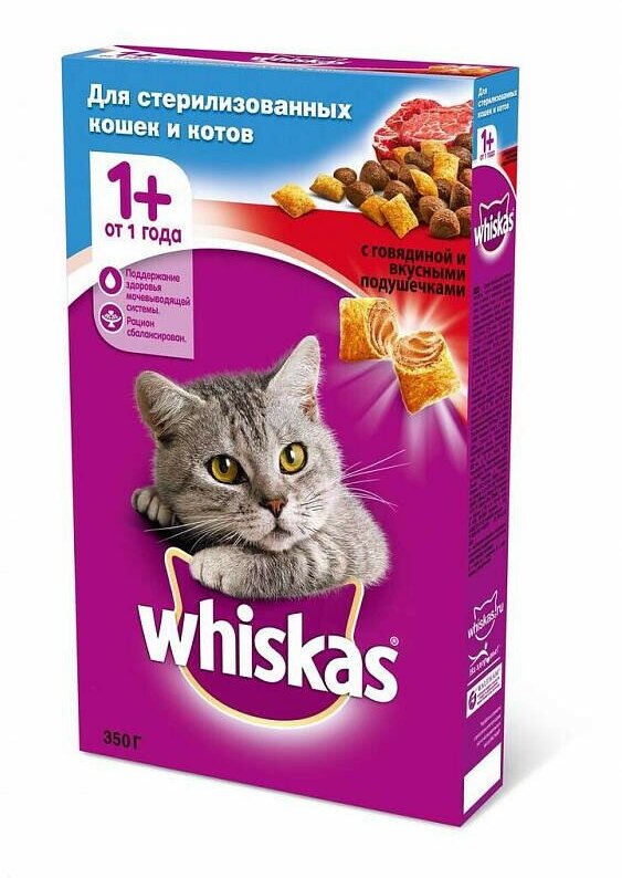 Создан специально, учитывая особые потребности Вашей любимицы. Хрустящие подушечки с нежным паштетом внутри обязательно придутся по вкусу Вашей кошке. Кроме того, Whiskas содержит все необходимое, чтобы еда Вашей стерилизованной любимицы была не только вкусной, но и полезной. Whiskas это: Оптимальное сочетание питательных веществ и нутриентов для подержания обмена веществ и здоровья мочевыводящей системы Витамин Е и цинк для иммунитета Омега-6 и цинк для здоровья кожи и шерсти Баланс кальция и фосфора для здоровья костей Витамин А и таурин для хорошего зрения Высокоусваиваемые ингредиенты и клетчатка для пищеварения Сухая текстура корма для удаления зубного налета.