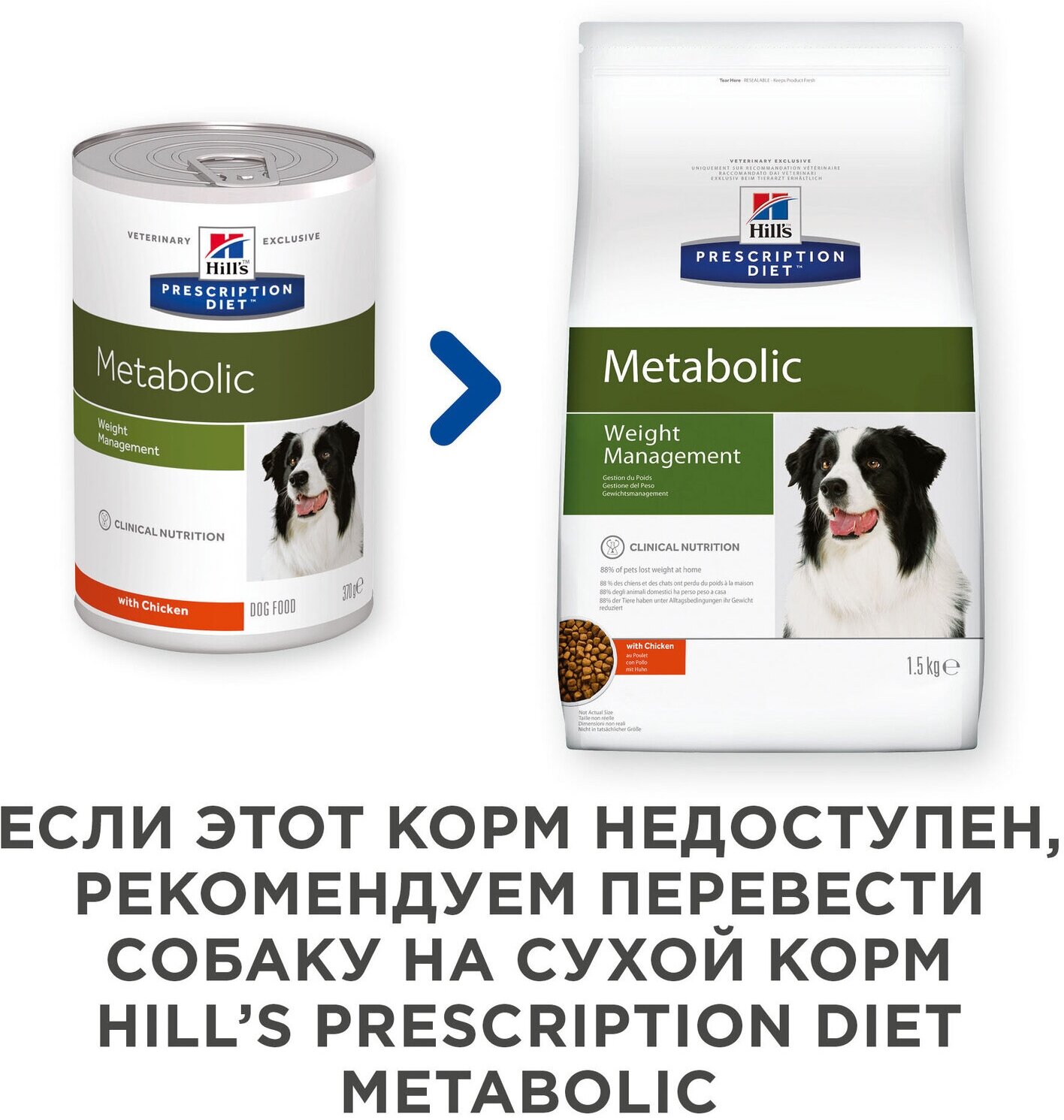 Консервы hills prescription diet metabolic - лечебный консервированный корм для коррекции веса у собак. Эффективность диеты хиллс доказана испытаниями и тестированиями. За 2 месяца 96% собак, принявших участие в исследовании, достигли снижения веса. 90% собак вышли на показатель нормального веса. Программа коррекции веса дает стабильный долгосрочный результат. Консервы хиллс метаболик - дополнение к сухому корму Hill's prescription diet metabolic canine original.