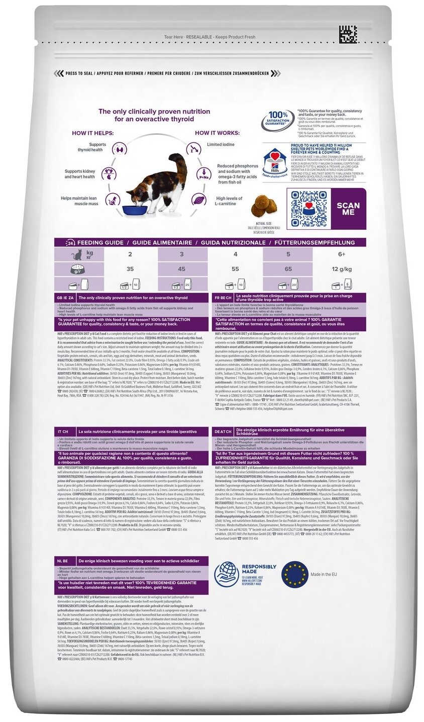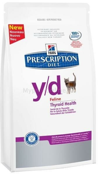 Hill`s Prescription Diet Feline Y/D Сухой диетический корм для кошек, лечение гипертиреоза Гипертиреоз (тиреотоксикоз) – является достаточно распространенной эндокринной патологией у пожилых кошек, которая связана с избыточной циркуляцией в организме гормонов щитовидной железы тироксина Т4 и-или трийодтиронина Т3. Перед использованием данного рациона рекомендуем обратиться за советом к ветеринарному специалисту.