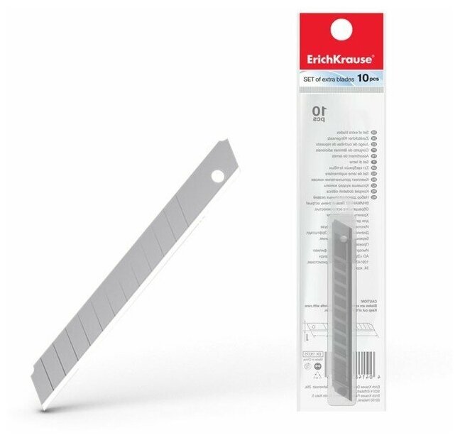 1013748 Лезвия для канцелярского ножа 9 мм, 10 шт, Erich Krause, в пластиковом контейнере Сегментированное износостойкое стальное лезвие с двухсторонней заточкой для канцелярского ножа. Поставляется в пластиковом контейнере для безопасного хранения.