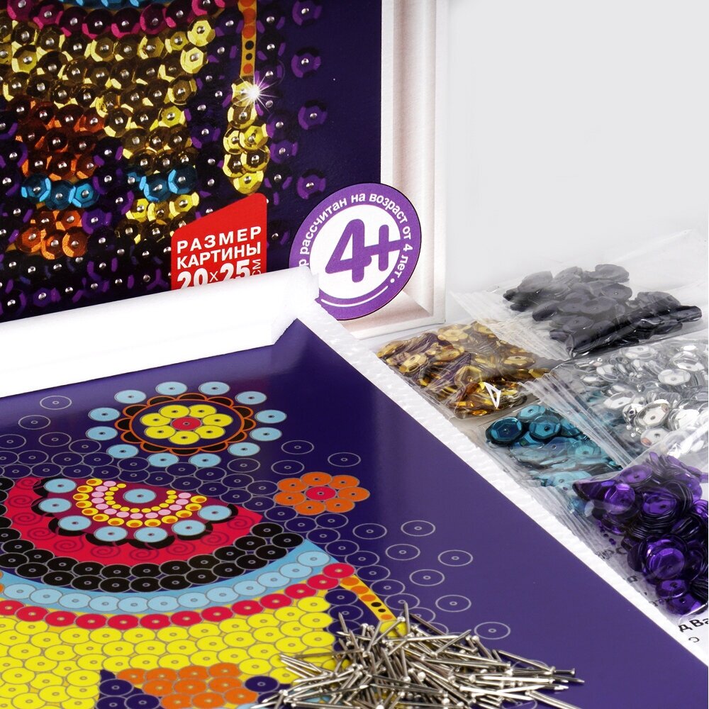 С помощью наборов этой серии Ваш ребенок сможет создать великолепную картинку из пайеток на цветной основе, которая станет не только отличным украшением дома , но и запоминающимся подарком для друзей и родственников.