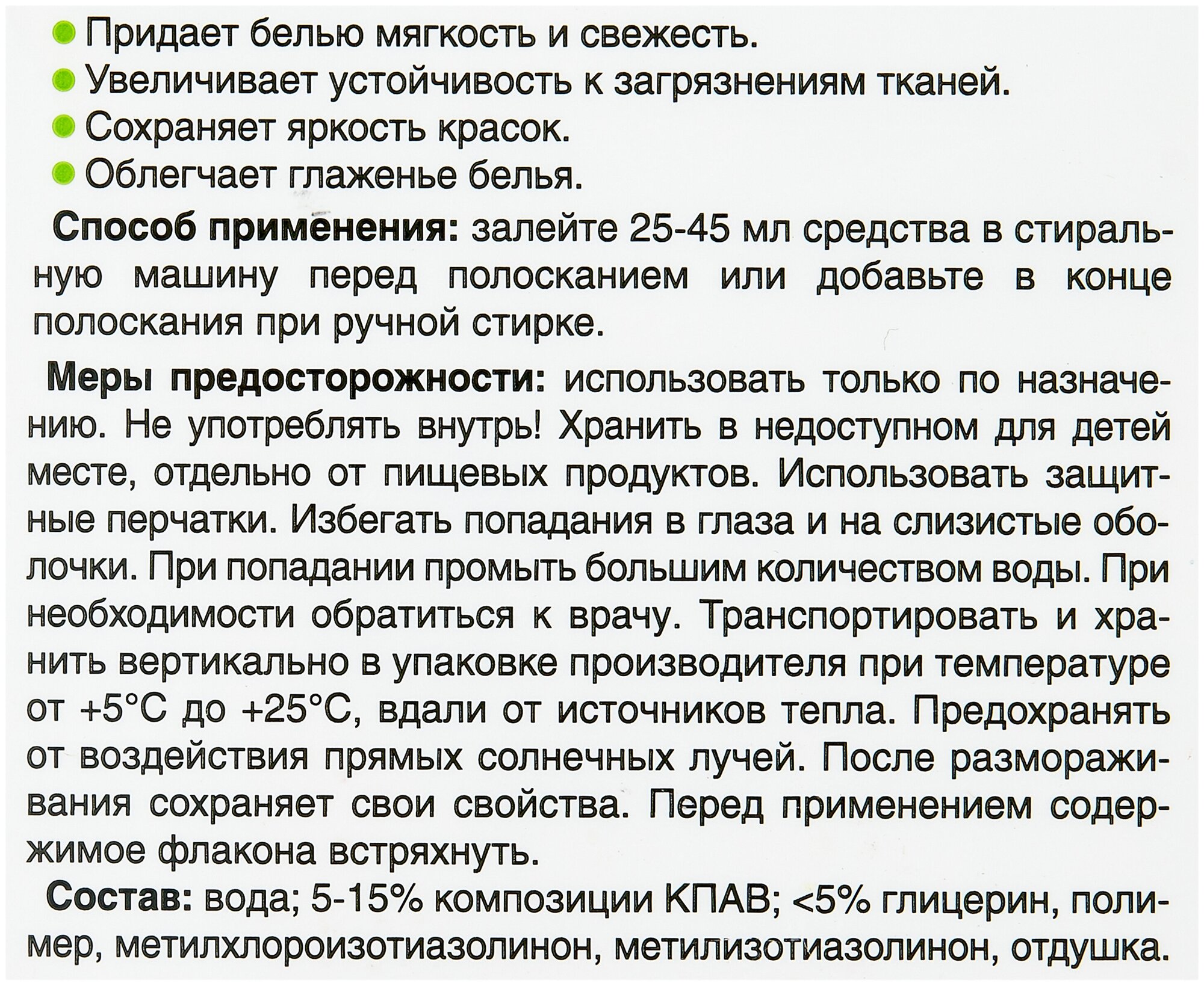 Универсальный кондиционер для белья с чистым и прохладным ароматом русского леса. Предназначен для смягчения и уменьшения износа тканей из хлопка, шерсти и синтетических материалов. Продлевает срок службы вещей, сохраняя их форму. Подходит как для ручной стирки, так и для стиральных машин любого типа.