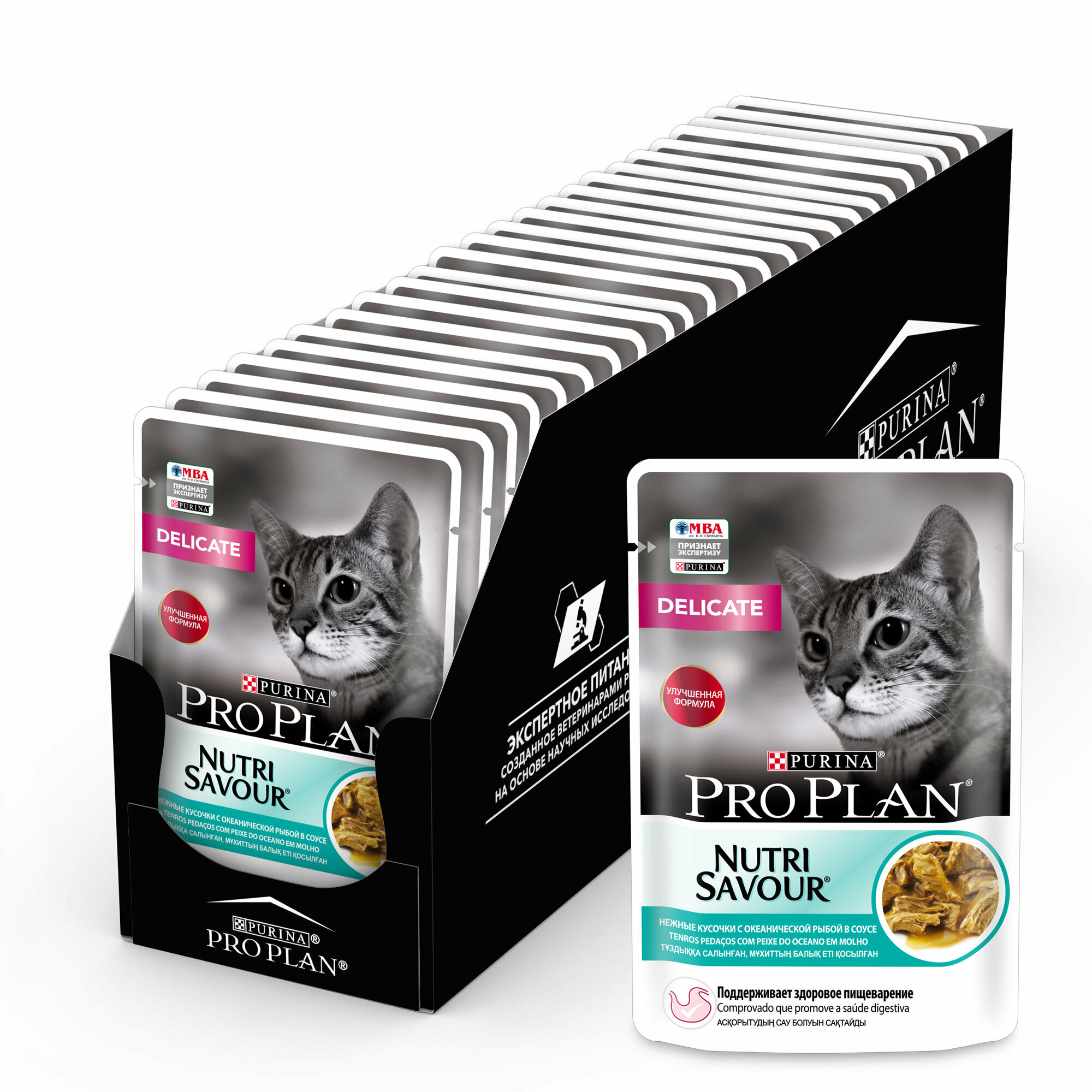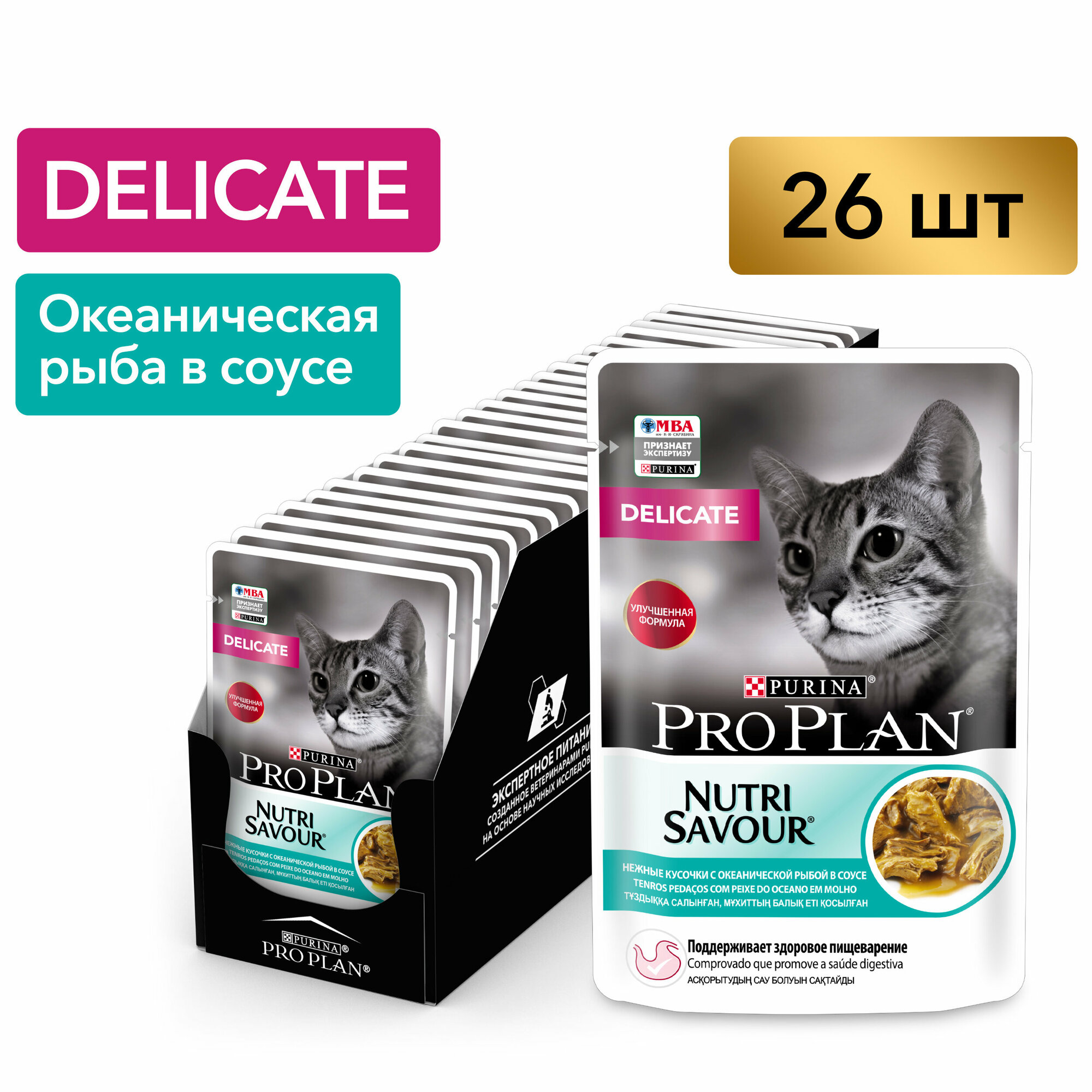 Для взрослых кошек с чувствительным пищеварением. С океанической рыбой в соусе. Хорошо усвояемые ингредиенты. Снижает риск возникновения кожных реакций, вызываемых непереносимостью к пище.Качественные ингредиенты такие как: треска, птица и индейка способствуют тщательному перевариванию пищи. Помогает уменьшить кожные реакции, связанные с пищевой непереносимостью. Нежные кусочки в пикантном соусе очень привлекательны для кошек благодаря запатентованной технологии производства департамента PURINA компании Nestle. Доказано: способствует улучшению пищеварения благодаря содержанию инулина, пребиотика, который помогает сбалансировать кишечную флору кошек с повышенной чувствительностью.Для взрослой кошки среднего веса (4 кг) требуется 3 пакетика в день, разделенных на два кормления. Рекомендации по кормлению, позволяющие поддерживать идеальную форму, могут меняться в зависимости от возраста животного, его активности и условий окружающей среды. Следите за весом вашей кошки и корректируйте количество даваемого корма. Подавайте корм комнатной температуры. Следите, чтобы у вашей кошки всегда была чистая свежая питьевая вода.