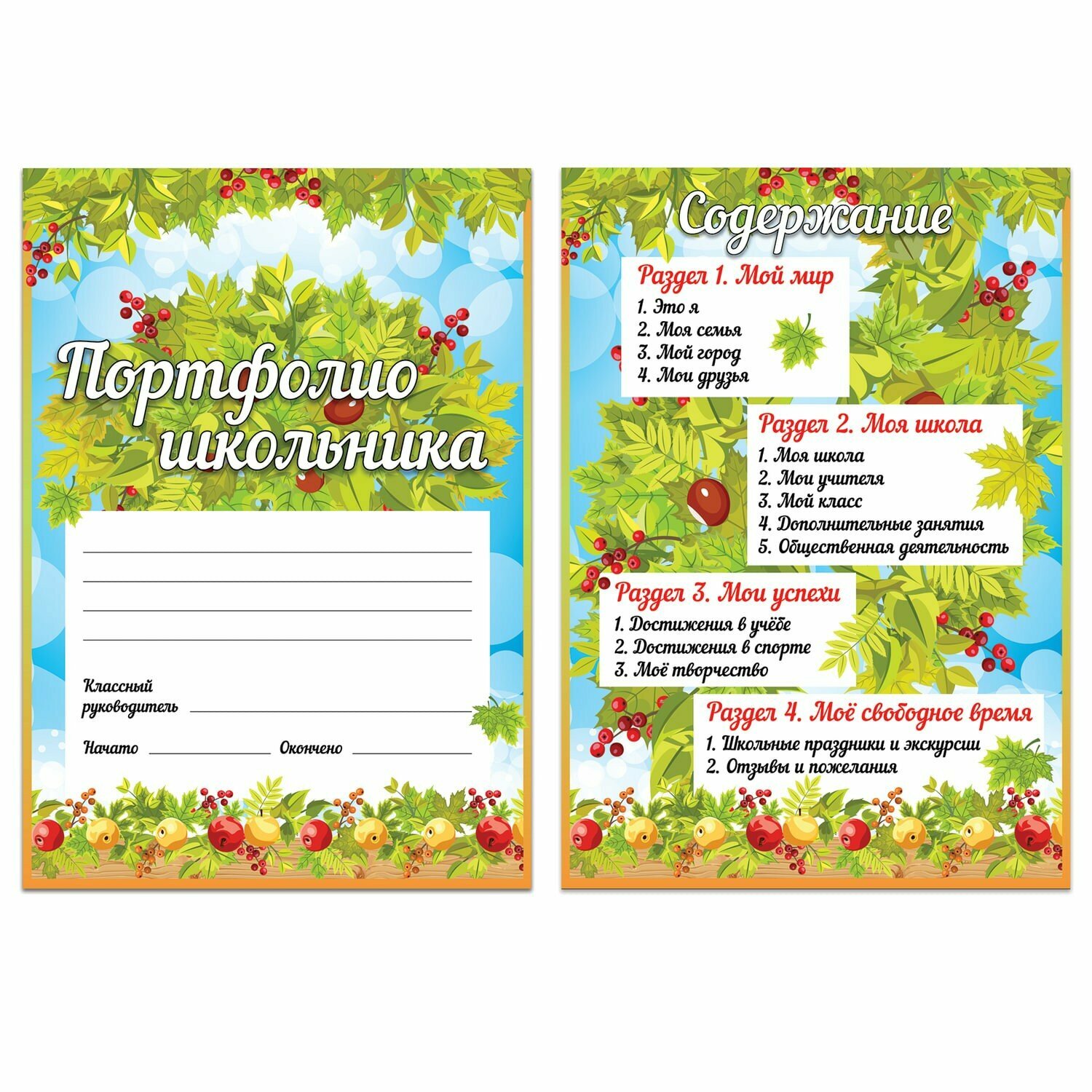 Портфолио позволяет учитывать результаты, достигнутые учеником в разнообразных видах деятельности: учебной, творческой, социальной и т.д. Содержит 14 тематических листов, раскрывающих большинство аспектов учебной и внеклассной жизни школьника.