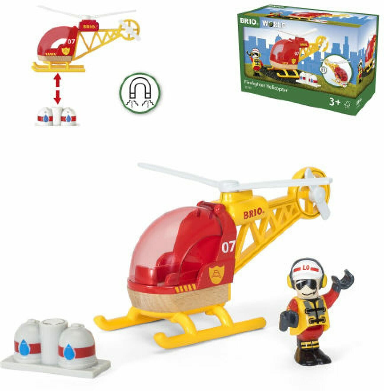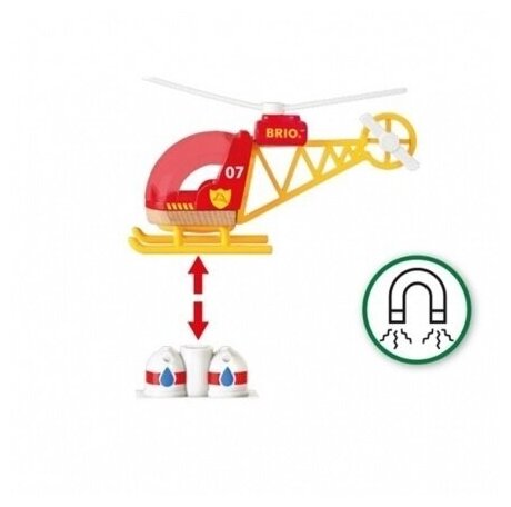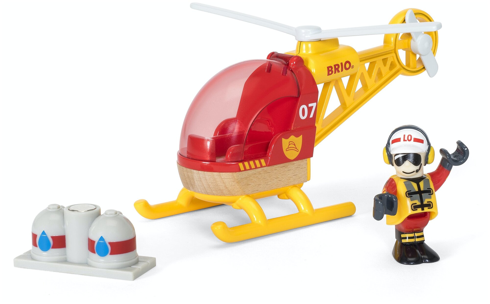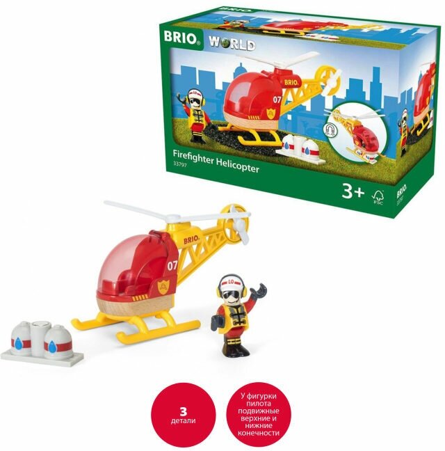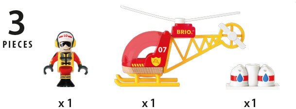 Игровой набор Спасательный вертолет от торговой марки Brio содержит три предмета: сам летательный аппарат, фигурку человека и груз. Все составляющие набор предметы изготовлены из качественного пластика и окрашены в яркие цвета. Фигурку пилота можно легко поместить в кабину вертолета благодаря открывающемуся окну. Такой набор прекрасно подойдет для организации тематической игры.