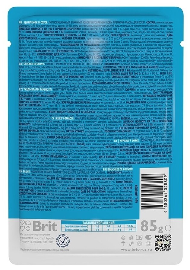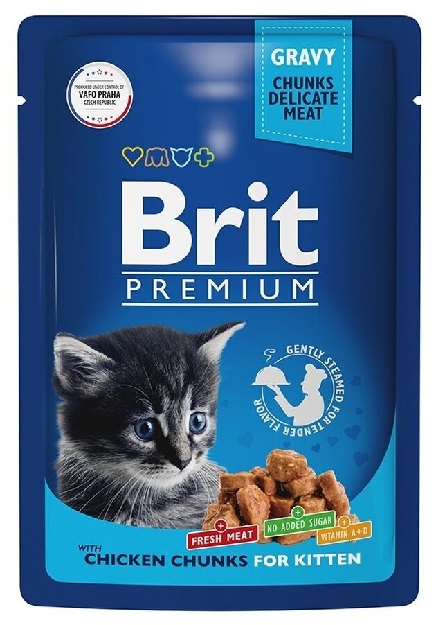 Влажный полнорационный корм Brit Premium имеет вкус курицы и предназначен для ежедневного питания котят в возрасте от месяца до года. Содержит комплекс веществ, необходимых для правильного развития растущего организма. Выполнен в виде отдельных кусочков, по структуре максимально приближенных к натуральному мясу. Благодаря этому котята повинуются инстинктам и быстро привыкают к питанию. Корм расфасован в пауч-упаковки по 100 г.ОсобенностиСбалансированный состав разработан специально для молодых кошек, ведущих активный образ жизни.Упаковка содержит подробную схему дозировки, поэтому не составляет труда правильно подобрать порцию исходя из веса.Яркий натуральный вкус привлекает животных и способствует быстрому поеданию корма, не позволяя ему застаиваться в миске.Влажная структура комфортна для неразвитого кишечника, помогает наладить стул и нормализует перистальтику.Высококачественные ингредиенты полезны для организма, не вызывают аллергических и прочих негативных реакций.