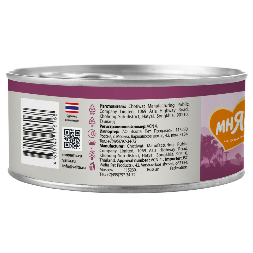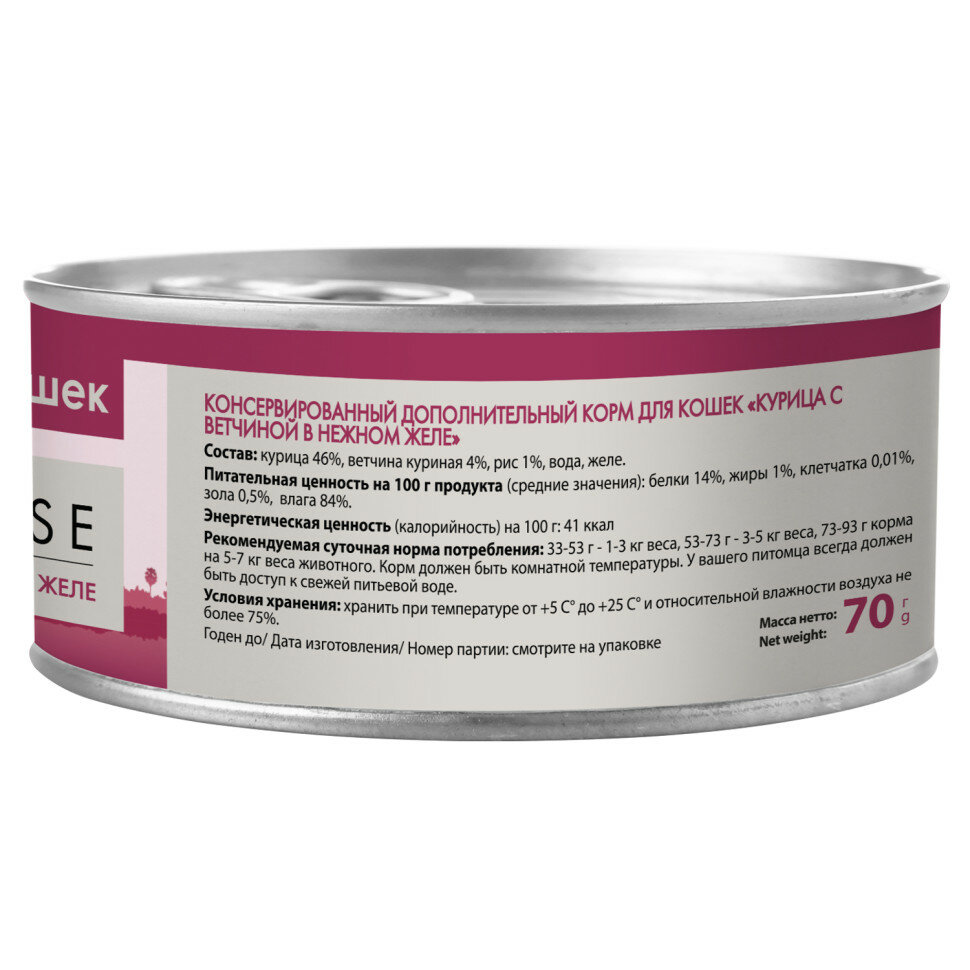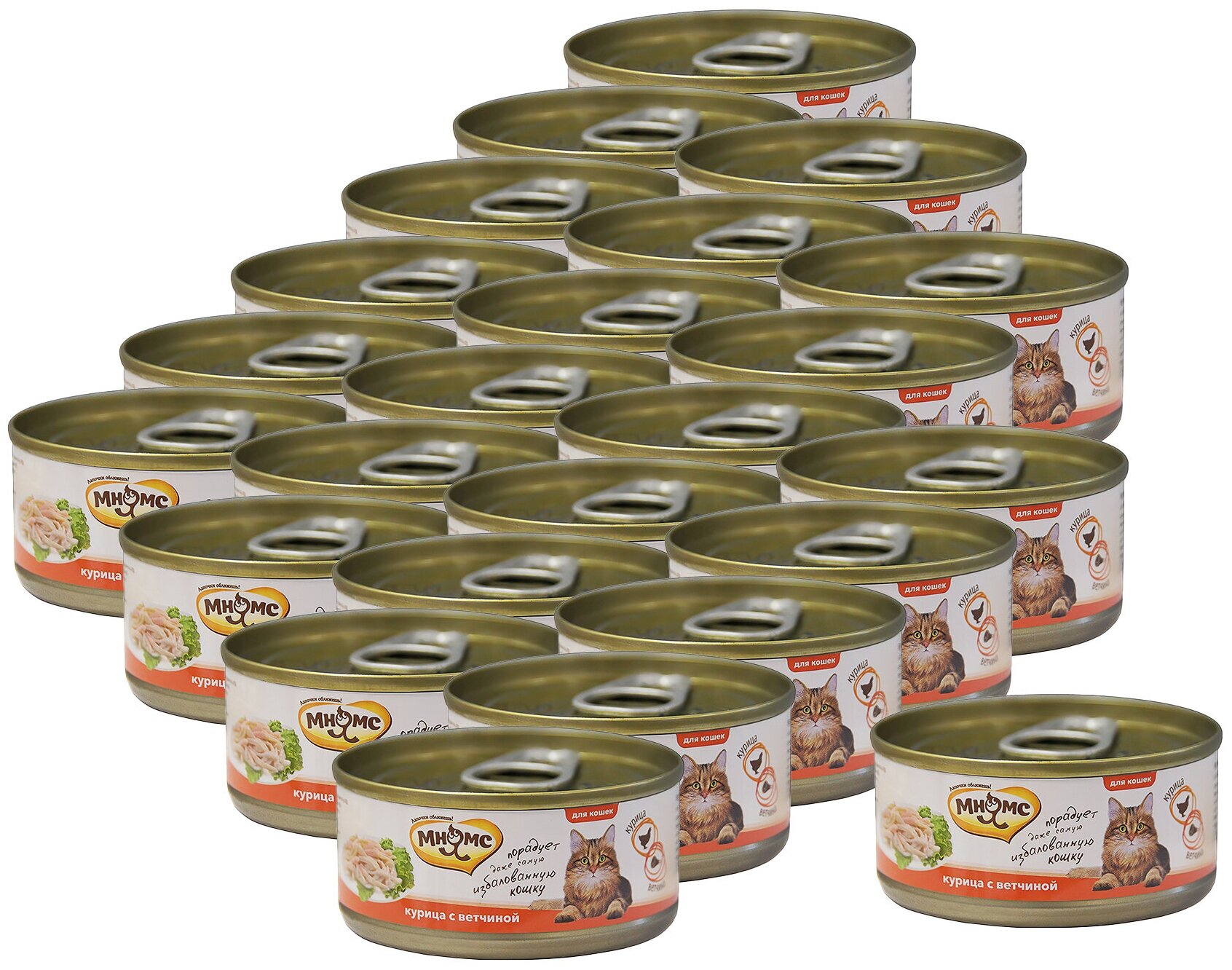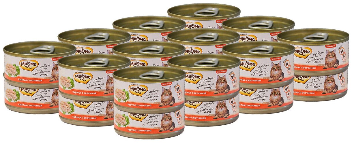 Консервы для кошек «Мнямс» состоят исключительно из отборных натуральных компонентов и не содержат сою, искусственные красители и усилители вкуса. В процессе производства консервов используется только отборное парное и охлажденное, а не замороженное сырье. Консервы из курицы изготовлены из нежного белого мяса куриных грудок с добавлением ветчины. Норма употребления: корм должен быть комнатной температуры. Рекомендуемая суточная норма – 70-90 г на 1 кг веса взрослого животного. У вашего питомца всегда должен быть доступ к свежей питьевой воде.