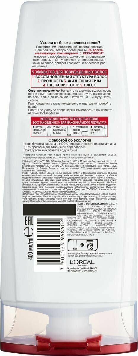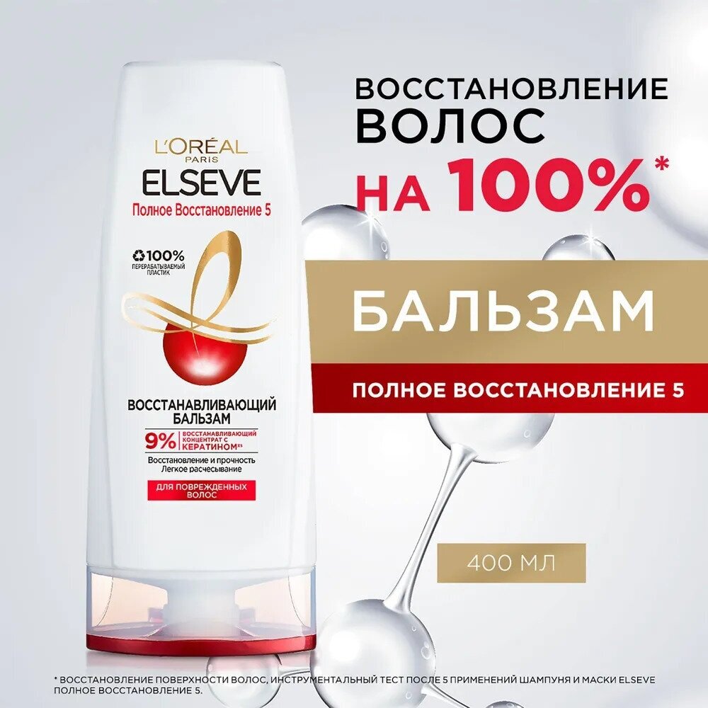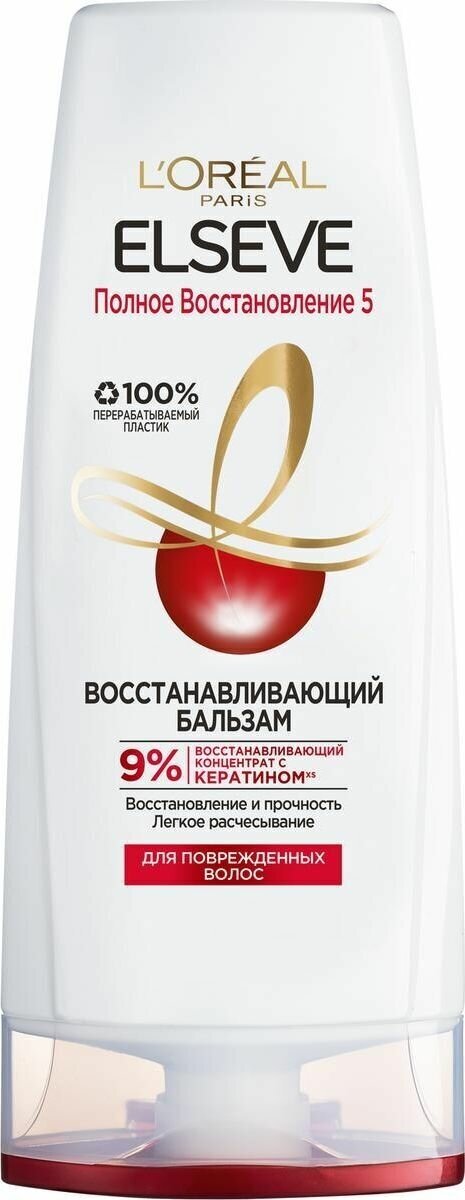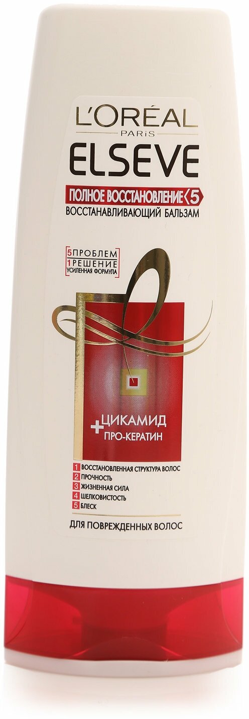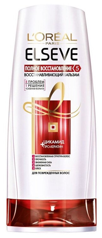Вам знакома одна из 5 проблем: безжизненные, жесткие, слабые, тусклые, неупругие волосы. Пять проблем - одно решение! Elseve Полное Восстановление 5 - первая гамма для полного восстановления поврежденных волос. Бальзам-ополаскиватель дополняет действие шампуня. Его формула с Про-Кератином и Керамидами восстанавливает волосы изнутри и снаружи. День за днем волосы полностью восстановлены. Восстановленная структура волос. Волосы наполнены жизненной силой. Волосы шелковистые. Прочные. Блестящие.