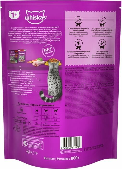 • Омега-6 и цинк для здоровья кожи и шерсти • Баланс кальция и фосфора для здоровья костей • Витамин А и таурин для хорошего зрения • Высокоусваиваемые ингредиенты и клетчатка для пищеварения • Сухая текстура корма для удаления зубного налета Бренд WHISKAS® рекомендует сочетать разные форматы корма в рационе Вашей кошки. Утром и вечером Вашей любимице нужно давать влажный рацион, а в течение дня — сухой. Это позволит объединить преимущества каждого из форматов, ведь ее рацион должен быть не только вкусным, но и полезным. Нужно помнить, что смешивать в одной миске сухой и влажный рационы не рекомендуется. Кроме того, у вашей любимицы всегда должен быть доступ к чистой питьевой воде. Рационы WHISKAS® содержат все необходимые витамины и минералы, белки, жиры и углеводы, чтобы поддержать здоровье Вашей кошки от усов до кончика хвоста. Хранить при температуре от + 4*С до + 35*С и относительной влажности воздуха не более 75%.