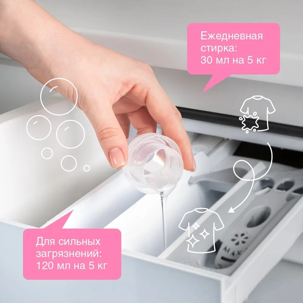 Комплексный состав заботится обо всех тканях с простым и даже деликатным характером: стирайте хлопок, синтетику и смешанные материалы без переживаний за их долговечность (но не забудьте выбрать корректный режим стирки и добавить кондиционер).