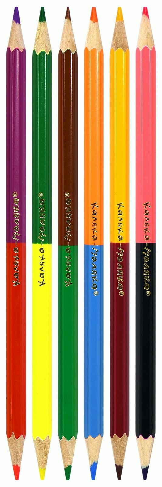 Каляка-Маляка Набор цветных карандашей 12 цветов, 6 шт., шестигранные с заточкой двусторонние, арт. КДКМ12 Двусторонние цветные карандаши Каляка-Маляка экономят место в сумочке ребенка, так как 6 карандашей позволяют рисовать 12 цветами: 6 основных цветов и 6 флуоресцентных. Сочетание основных цветов с флуоресцентными позволяет ребенку воплотить самые яркие и удивительные фантазии.