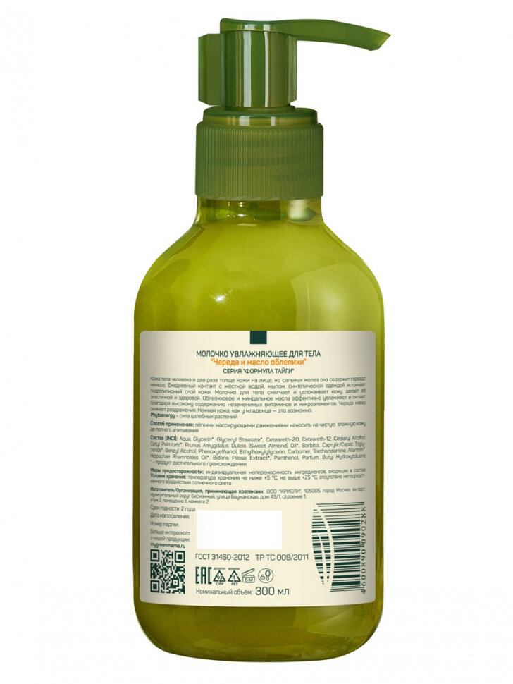 Кожа тела человека в два раза толще кожи на лице, но сальных желез она содержит гораздо меньше. Ежедневный контакт с жёсткой водой, мылом, синтетической одеждой истончает гидролипидный слой кожи. Молочко для тела смягчает и успокаивает кожу, делает её эластичной и здоровой. Облепиховое и миндальное масла эффективно увлажняют и питают благодаря высокому содержанию незаменимых витаминов и микроэлементов. Череда мягко снимает раздражения. Нежная кожа как у младенца — это возможно.