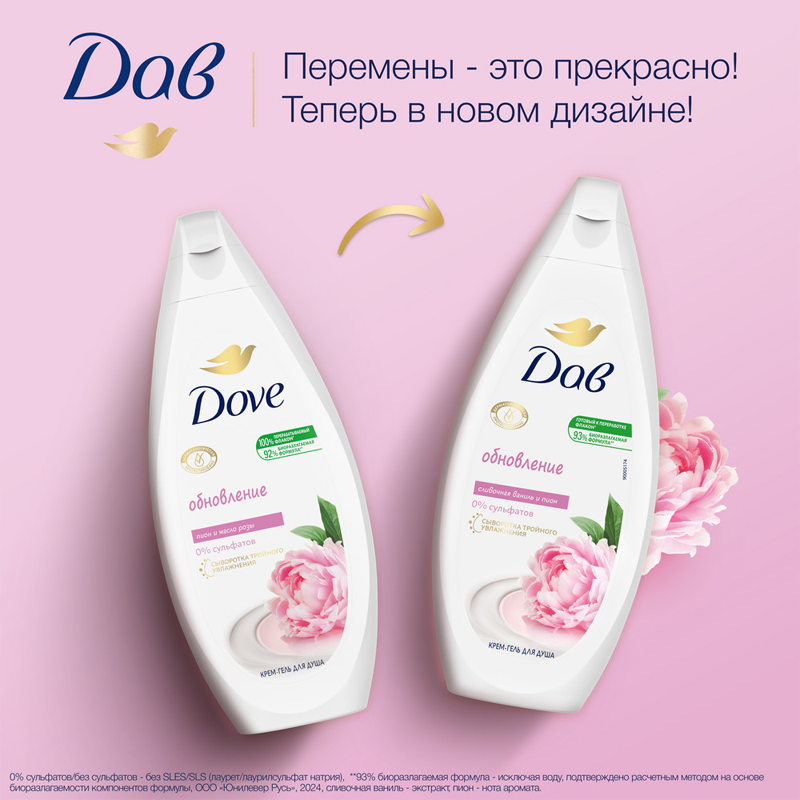 Появление бренда Dove связано с созданием уникального очищающего средства для кожи, не содержащего щелочи. Формула единственного в своем роде крем-мыла на четверть состоит из увлажняющего крема - именно это его качество помогает защищать кожу от раздражения и сухости, которые неизбежны при использовании обычного мыла. Dove —марка, которая известна благодаря авангардному изобретению: мягкому крем-мылу. Dove любим миллионами, ведь они не содержат щелочи, оказывают мягкое, щадящее воздействие на кожу лица и тела. Удивительное по своим свойствам крем-мыло довольно быстро стало одним из самых популярных косметических средств. Успех этого продукта был настолько велик, что производители долгое время не занимались расширением ассортимента. Прошло почти сорок лет с момента регистрации товарного знака Dove, прежде чем свет увидел крем-гель для душа и другие косметические средства этой марки. Все они создаются на основе формулы, разработанной еще в прошлом веке, но не потерявшей своей актуальности. На сегодняшний день этот бренд по праву считается олицетворением красоты, здоровья и женственности. Помимо женской линии косметики выпускаются детские косметические средства и косметика для мужчин. Несмотря на широкий ассортимент предлагаемых средств по уходу за кожей и волосами, завоевавших признание в более чем 80 странах по всему миру, производители находятся в постоянном поиске новых формул. Dove считается одним из ведущих в своей области. Он известен миллионам людей в почти сотне стран по всему миру. В мире Dove красота — это источник уверенности в себе, а не беспокойства. Миссия бренда — дать новому поколению возможность расти в атмосфере позитивного отношения к собственной внешности. Крем-гель для душа Dove образует нежное облако кремообразной пены, заботливо очищающее вашу кожу. Сладкий аромат сливочной ванили и пиона подарит наслаждение и возможность побаловать себя. Делает Вашу кожу гладкой и нежной сразу после душа. Благодаря уникальному сочетанию ухаживающих компонентов NutriumMoisture, которые обеспечивают больше естественного питания для Вашей кожи, чем большинство гелей для душа. Делает кожу более нежной и гладкой сразу после душа.